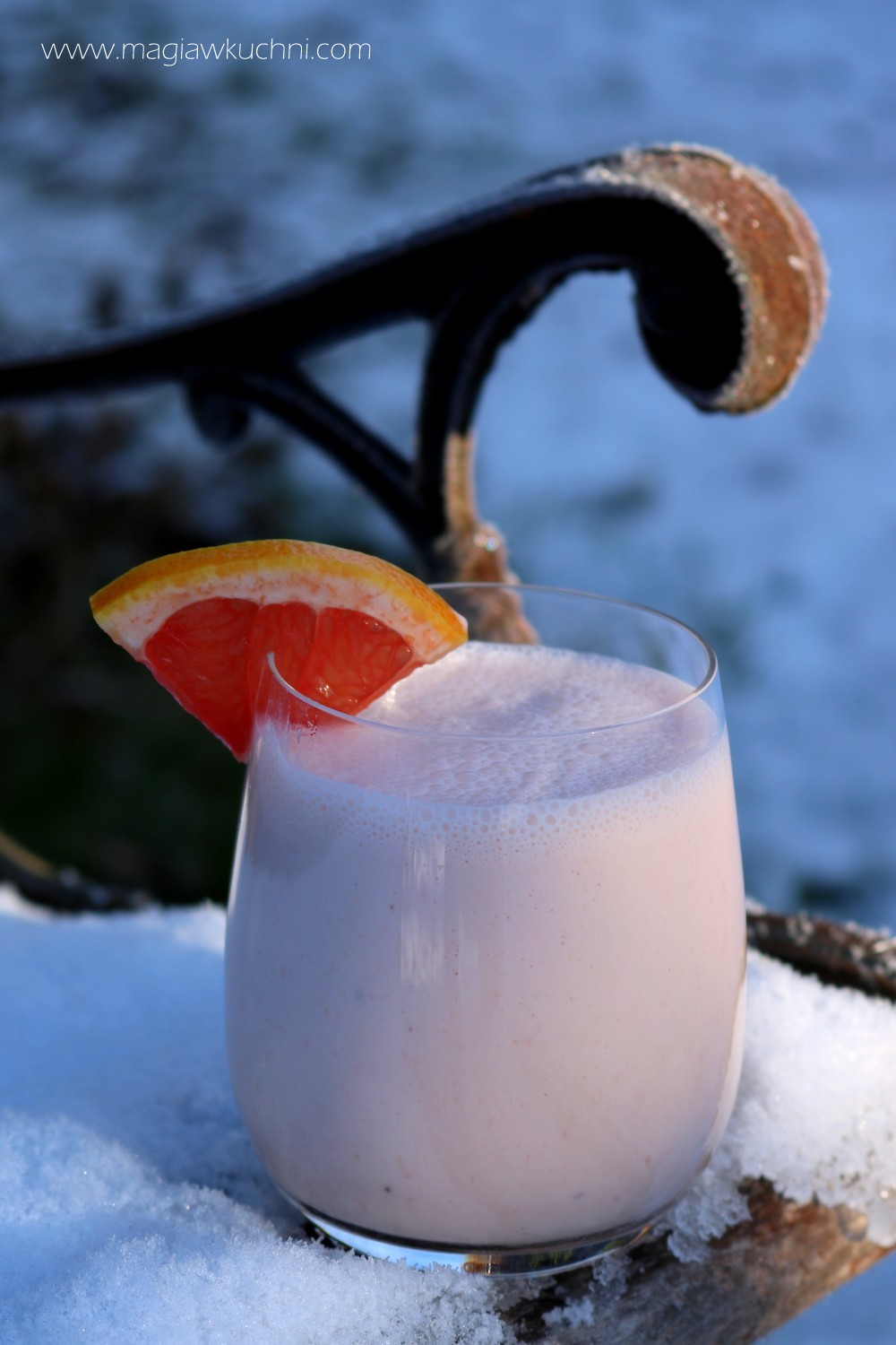 Do blendera wlać jogurt, owoce sparzyć i zetrzeć skórę. Następnie obrać pozostałą skórę tak oczyszczone kawałki pomarańczy i grejpfruta dodać do jogurtu wraz z obranym bananem i zmiksować.