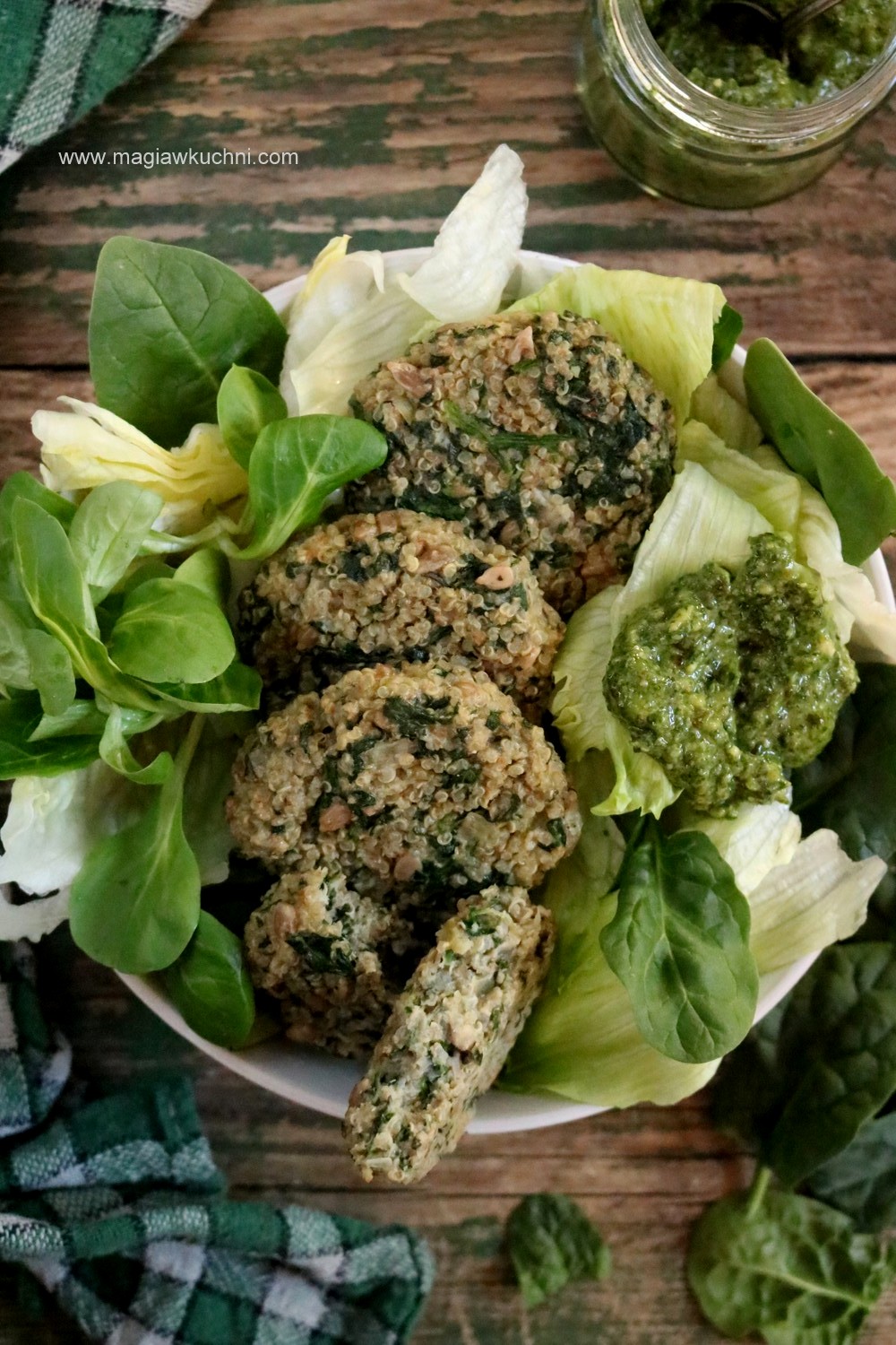 Ugotuj komosę według przepisu na opakowaniu. Rozgrzej łyżkę oleju i wrzuć szpinak w międzyczasie obierz dwa ząbki czosnku i zetrzyj na tarce – dodaj do szpinaku i wymieszaj. Przesmażony szpinak przełóż na deskę i posiekaj dodaj do ugotowanej kaszy. Cebulę obrać i pokroić na drobno w kostkę – usmażyć na rumiano a następnie przełożyć do kaszy . Do chłodnej masy dodać jajka oraz mąkę wymieszać odstawić na 15 minut w tym czasie rozgrzać piekarnik 180 C a blachę wyłożyć papierem do pieczenia. Ręce nawilżać w wodzie i formować burgery okładać na blaszce i lekko spłaszczać wstawić do nagrzanego piekarnika i piec ok 25-30 minut aż się lekko zrumienią, wystudzić.
