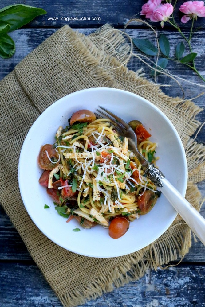 Ostatnie dni ciepła wykorzystujemy na prace w ogrodzie i przygotowujemy się do zbliżającej się jesieni. Robimy porządki i zrywamy ostatnie pomidory, a kiedy brak czasu na gotowanie taki makaron robi się praktycznie sam w15 minut i obiad na stole pyszny, aromatyczny z pomidorkami z ogrodu 😉 Polecam