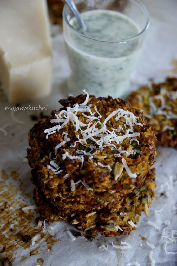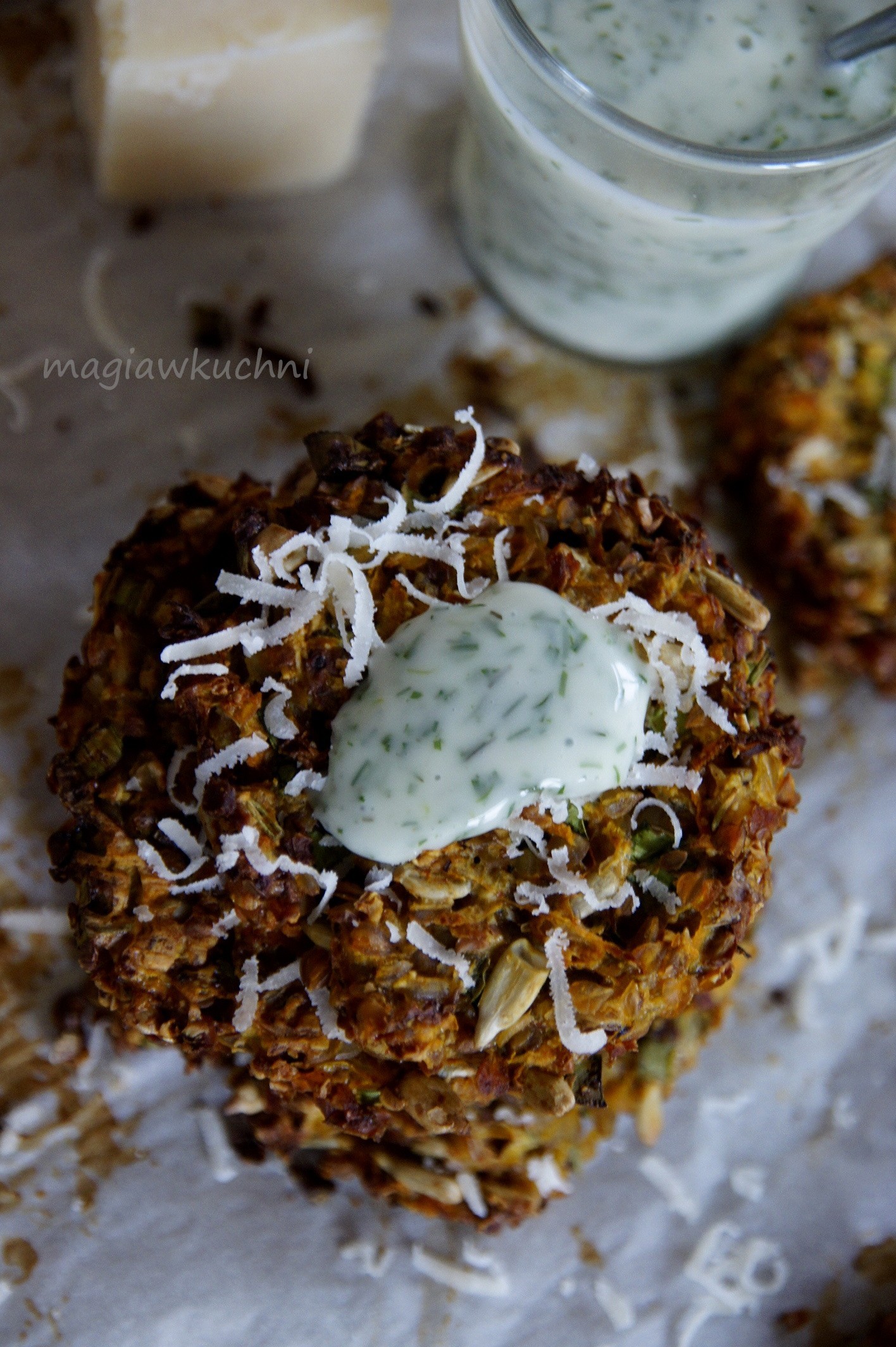 Blachę wyłożyć papierem do pieczenia nakładać po łyżce farszu i formować okrągłe placki łyżką. (na mojej blaszce mieści mi się dziewięć placków) Piekarnik nagrzać do 180 C i wstawić blachę z plackami piec ok 10 minut po tym czasie delikatnie odrywać od papieru najlepiej płaską łopatką – uważać aby się nie poparzyć odwrócić na drugą stronę i piec kolejne 10 minut do zrumienienia się. Podawać z sosem jogurtowym