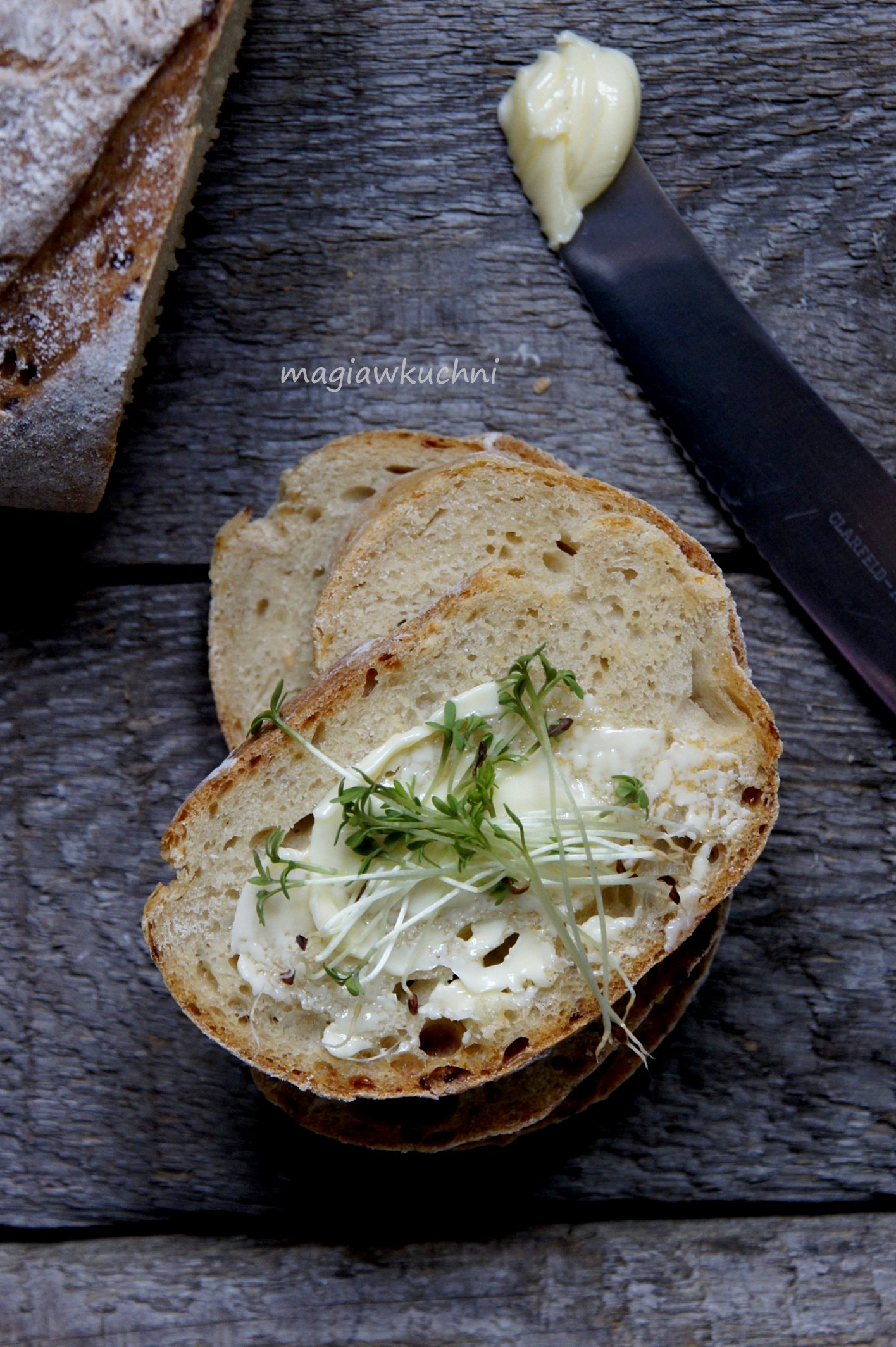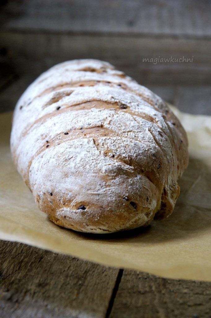 Rozgrzać w tym czasie piekarnik do temp 200 C a na dno postawić miseczkę z wodą. Piec ok 20 minut w temp 200 C a następnie zmniejszyć do 180 C i piec jeszcze 40-50 minut. Można sprawdzić patyczkiem czy niema surowego ciasta a dno chleba powinno wydawać głuchy dźwięk.