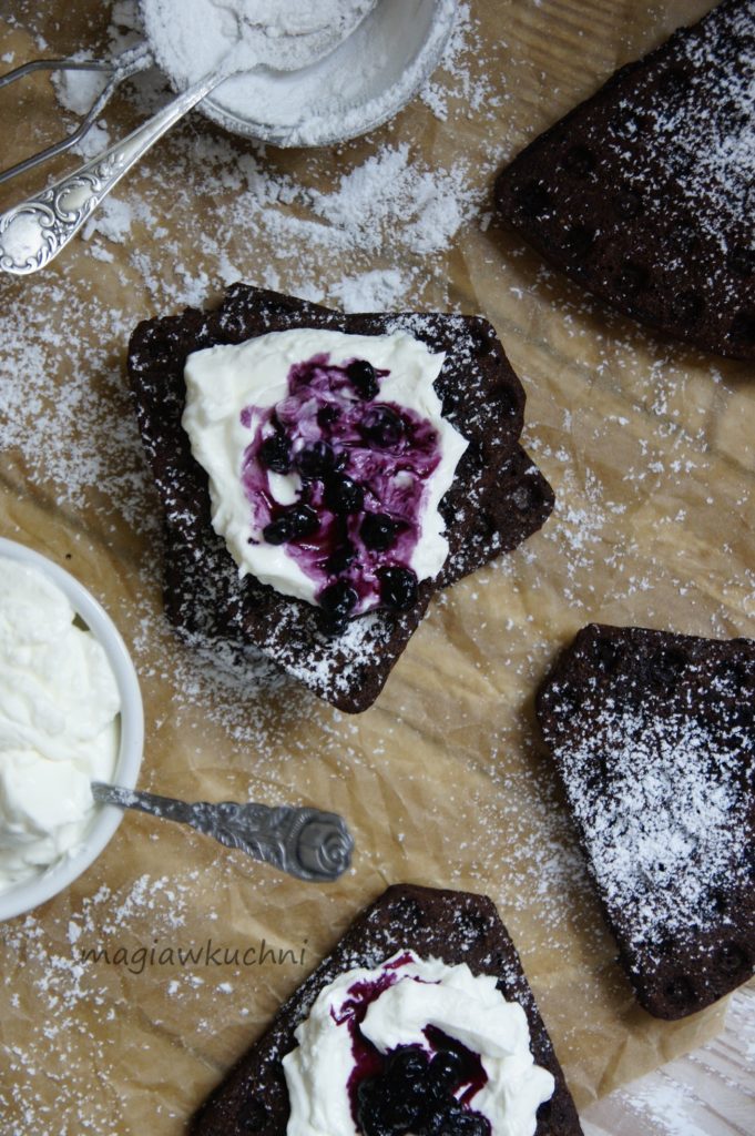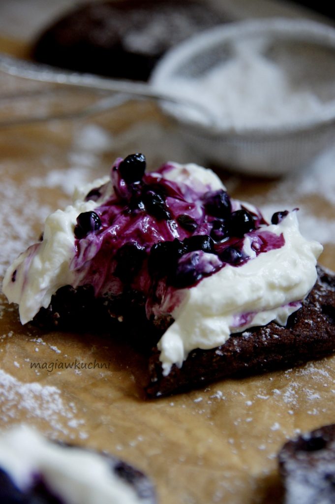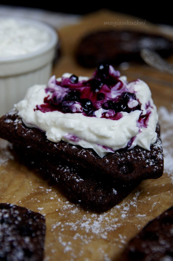Tak przygotowane gofry studzę chwilkę na kratce obsypuje lekko cukrem pudrem na wierzch kładę serek i polewam jagodami z syropu.