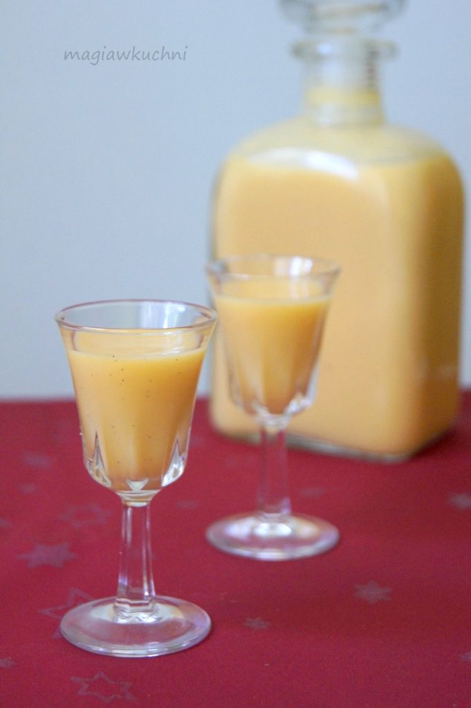Żółtka utrzeć na gładką masę z cukrem pudrem. (nie może być grudek cukru gdyż alkohol tego nie rozpuści) Następnie dolewamy powoli mleko ,spirytus – cały czas miksując. Laskę wanilii przecinamy wzdłuż i wyciągamy ziarenka które dodajemy do alkoholu – całość miksujemy Przelać do butelek i przechowywać w chłodnym miejscu.