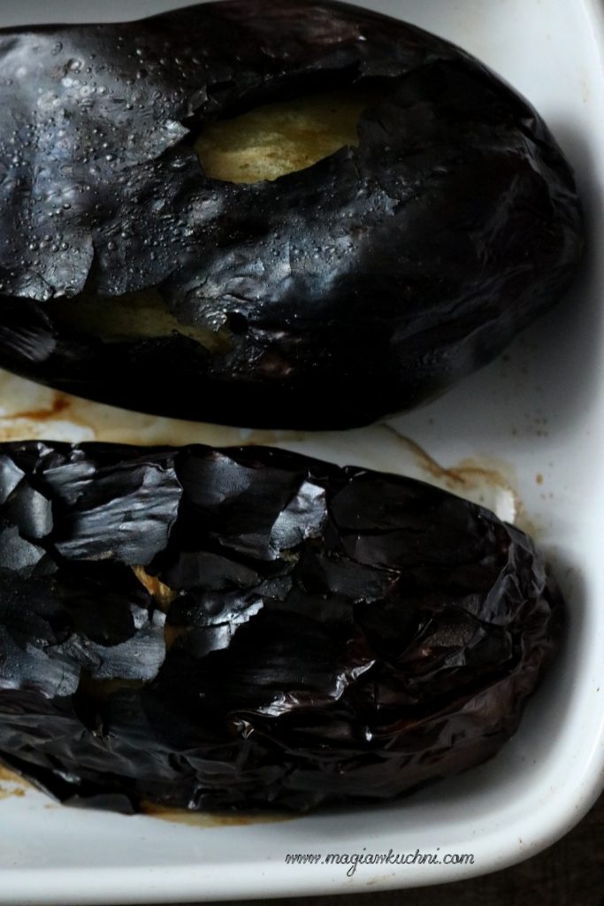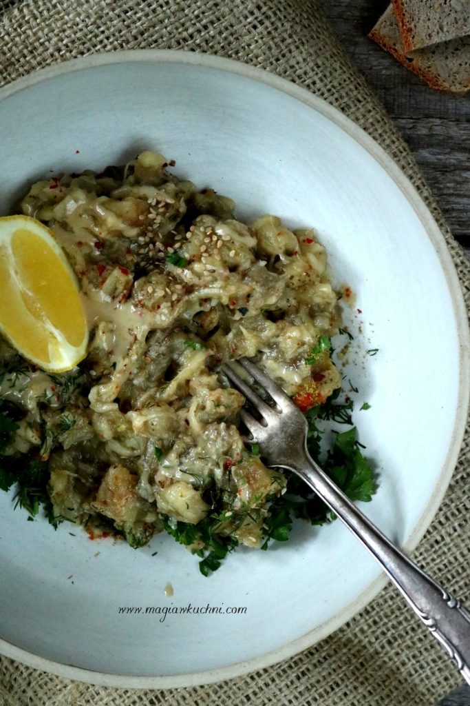 Bakłażany umyć i ułożyć na palnikach kuchenki gazowej i opiekać ok 15 minut aż zrobią się zwiotczałe i zwęglone obracać je co jakiś czas. Gdy bakłażany będą już porządnie opieczone przełożyć do formy i wstawić do nagrzanego piekarnika 200 C i piec ok 15-20 minut do miękkości. Gorące wyjąć z piekarnika i obrać ze skórki , posiekać nożem i przełożyć do miski wymieszać z rozgniecionym czosnkiem sporą ilością soli i resztą przypraw na końcu polać tahini oraz sokiem z cytryny . Posyp jeszcze świeżym koperkiem oraz natką pietruszki a jeżeli masz kolendrę i jesteś jej miłośnikiem też jej nie żałuj. Polecam