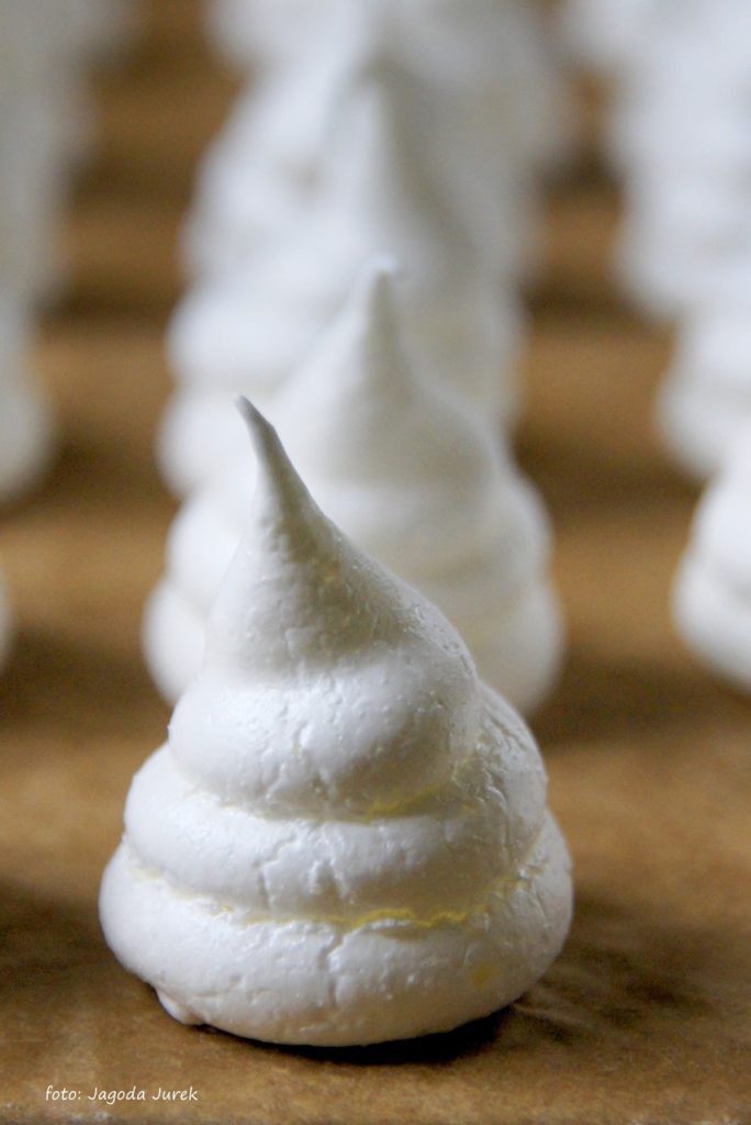Białka przełożyć do miski dodać szczyptę soli , ubijać i stopniowo dodawać cukru aż białka ubiją się na sztywno. Następnie dodać soku z cytryny i jeszcze przemieszać delikatnie. Masę przełożyć do worka ze szprycą i wyciskać małe beziki na blachę wyłożoną papierem do pieczenia.