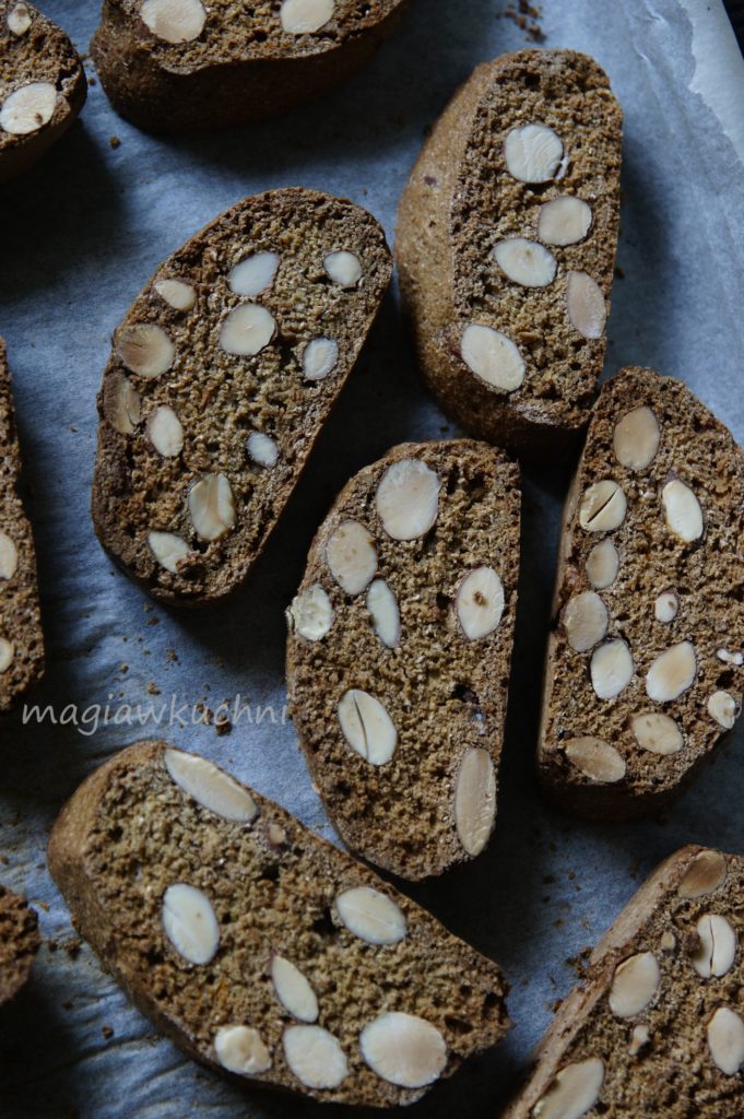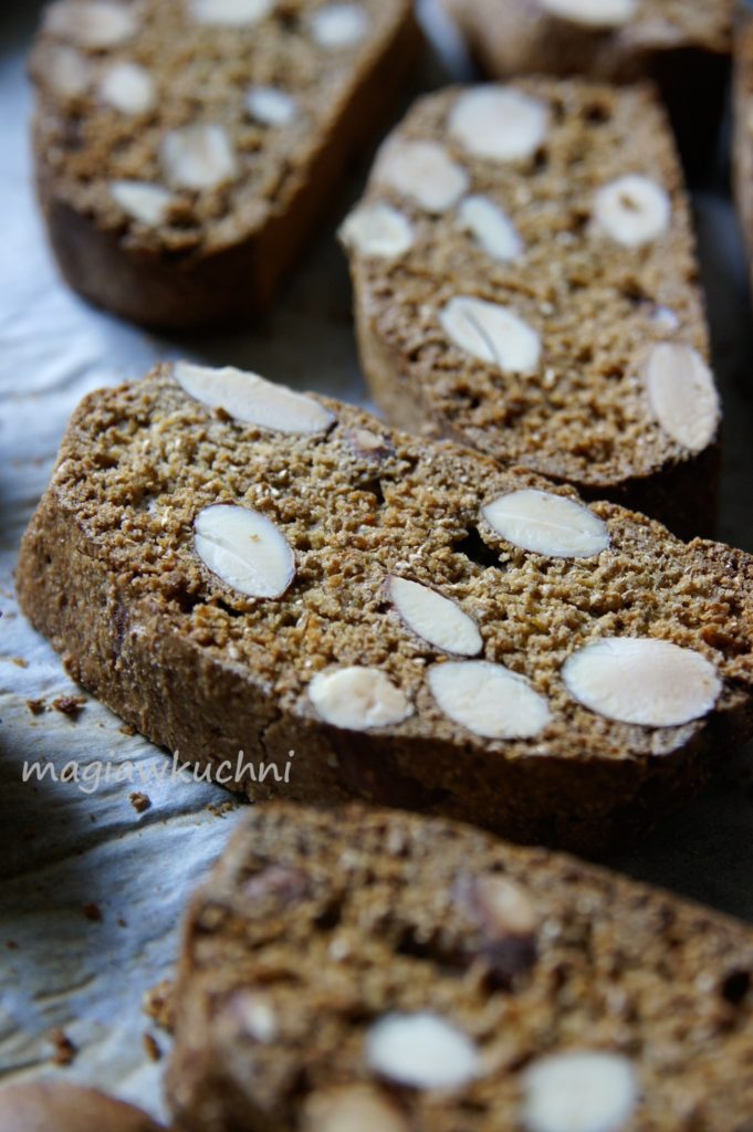 Biscotti w mojej wersji razowej , to takie włoskie sucharki które szczelnie zamknięte można przechowywać nawet kilka miesięcy choć u nas z pewnością tak długo nie poleżą .Pieczone za czasów jeszcze ,,Wypiekanie na śniadanie,, Dziękuję wszystkim za wspólne pieczenie 🙂 trochę brakuje mi tego wspólnego wypiekania 😉 Wszystkim polecam bo warto spróbować oj warto …