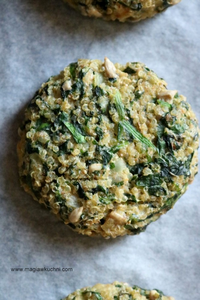 Ugotuj komosę według przepisu na opakowaniu. Rozgrzej łyżkę oleju i wrzuć szpinak w międzyczasie obierz dwa ząbki czosnku i zetrzyj na tarce – dodaj do szpinaku i wymieszaj. Przesmażony szpinak przełóż na deskę i posiekaj dodaj do ugotowanej kaszy. Cebulę obrać i pokroić na drobno w kostkę – usmażyć na rumiano a następnie przełożyć do kaszy . Do chłodnej masy dodać jajka oraz mąkę wymieszać odstawić na 15 minut w tym czasie rozgrzać piekarnik 180 C a blachę wyłożyć papierem do pieczenia. Ręce nawilżać w wodzie i formować burgery okładać na blaszce i lekko spłaszczać wstawić do nagrzanego piekarnika i piec ok 25-30 minut aż się lekko zrumienią, wystudzić.