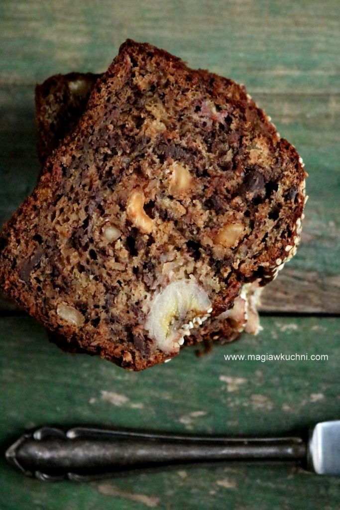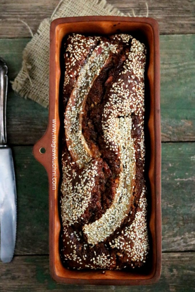Piekarnik rozgrzać 180 C , orzechy posiekać i uprażyć na rumiano na suchej patelni . Wymieszać w misce mokre składniki rozgnieć 4 banany dodaj oliwę , jajka, miód , tahini oraz cukier do połączenia . Następnie dodaj posiekaną czekoladę, orzechy oraz przesianą mąkę z sodą . Wylej do formy wyłożonej papierem do pieczenia , banana przekrój wzdłuż i wyłóż na ciasto w formie posyp sezamem i wstaw do nagrzanego piekarnika i piecz ok 50 minut do tzw suchego patyczka. Wystudzić w uchylonym piekarniku .