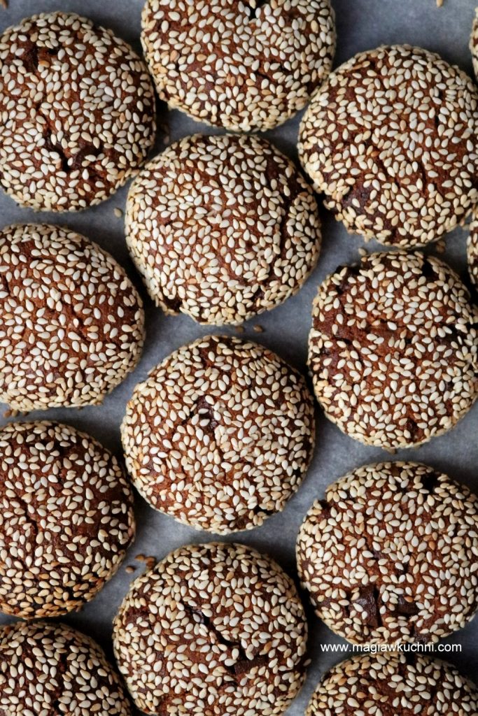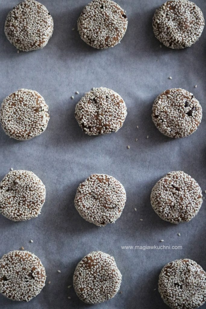 Teraz do miski blendera przełożyć olej kokosowy dodać tahini, syrop klonowy i przygotowane wcześniej jajko lniane całość zmiksować na jednolitą masę. Następnie posiekać czekoladę na drobniejsze kawałki i wsypywać razem z mąką i sodą – zagnieść ciasto. Podzielić na ok 15 kulek obtaczać dokładnie w sezamie i lekko zgniatać. Ciasteczka układać na blaszce wyłożonej papierem do pieczenia, wstawić do nagrzanego piekarnika 200 C i piec ok 30 minut do lekkiego zrumienienia .