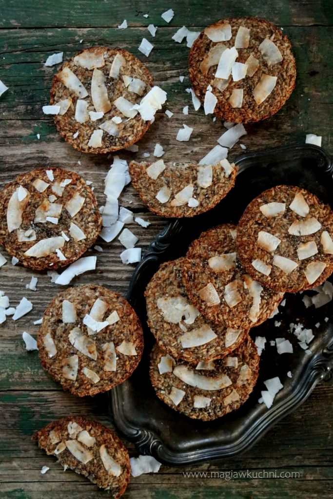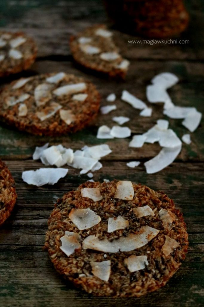 Banany utrzeć z masłem orzechowym dodać zmielone siemię lniane oraz dwie łyżki chia – wymieszać . Następnie wsypujemy wiórki kokosowe i płatki jaglane – ponownie mieszamy – odstawić na ok 15-20 minut aż masa zgęstnieje. Po tym czasie wyłożyć blachę papierem do pieczenia i wykładać po łyżce formując okrągłe ciasteczka posypać chia i płatkami kokosa – delikatnie wcisnąć w masę. Blachę wstawić do nagrzanego piekarnika 180 C i piec ok 15 minut z jednej strony po czym odwrócić je na drugą za pomocą płaskiej łopatki i piec kolejne ok 15 minut aż ciasteczka się zrumienią. Wystudzić na kratce , przełożyć do pojemnika i przechowywać w lodówce.