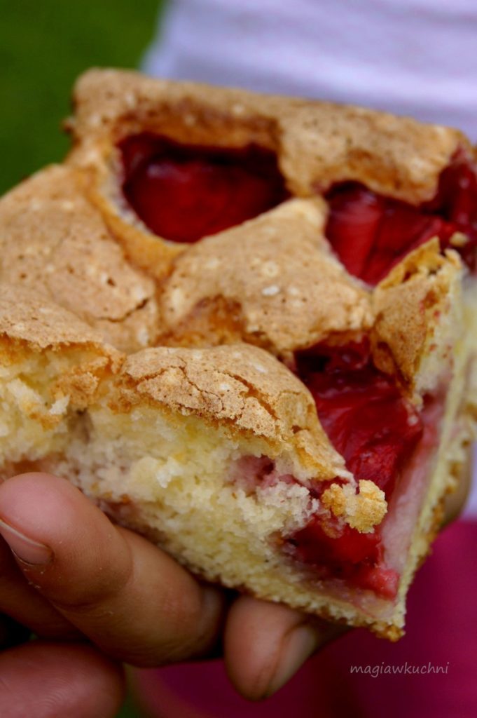 Bardzo delikatne ciasto z truskawkami na maślance, uwielbiam ciasta owocowe jemy je razem z dziećmi 🙂 nie ma jak domowy placek…