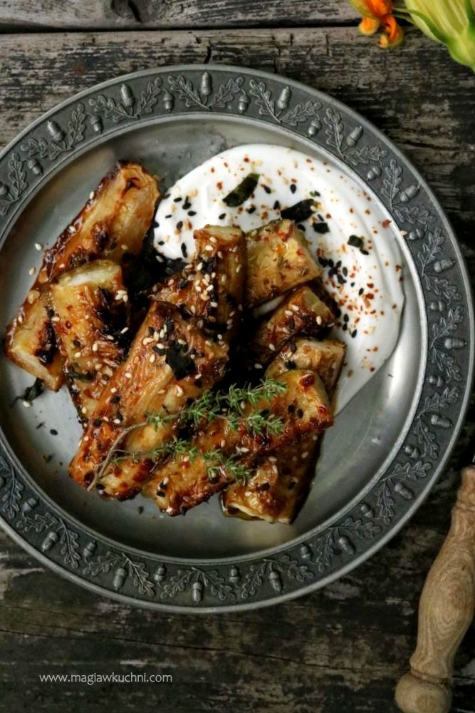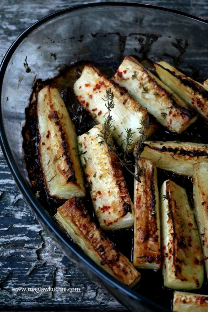 Teraz przygotuj marynatę do małej miseczki przełóż pastę miso, dolej ciepłą wodę i wymieszaj , obierz i zetrzyj czosnek do pasty dodaj jeszcze cukier kokosowy i oliwę – wszystko dokładnie wymieszaj . Marynatę przełóż na cukinie i wymieszaj dokładnie najlepiej rękoma. Posyp jeszcze tymiankiem i płatkami chili. Wstawić do nagrzanego piekarnika 180 C i piec ok 20 minut .