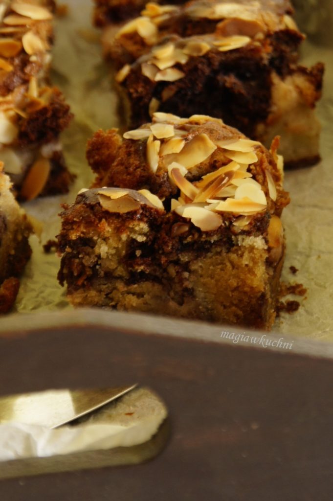 W misce najpierw wymieszać mokre składniki , kolejno przekładać żółtka,maślankę,olej, miód i otartą skórkę z cytryny – wymieszać do połączenia składników. W drugiej misce wymieszać mąkę z sodą i proszkiem do pieczenia. dodać do mokrych składników. Białka ubić na sztywno ze szczyptą soli dodając stopniowo cukier. Ubite białka delikatnie wymieszać z masą, odlać 1/4 ciasta i wymieszać z kakao. Blachę wyłożyć papierem do pieczenia wylewać białą masę co jakiś czas dodawać kakaowej aż do wyczerpania. Następnie wciskać w ciasto wcześniej przygotowane jabłka , posypać kawałkami chałwy oraz płatkami migdałów i wstawić do nagrzanego piekarnika 180 C i piec ok 60 minut do tzw suchego patyczka – wystudzić w uchylonym piekarniku.