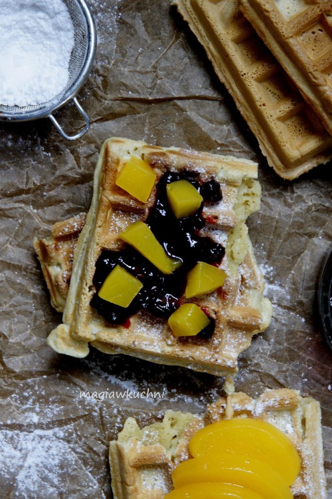 W ramach wypiekanie na śniadanie tym razem zapraszam na gofry w wersji orkiszowej . Pyszne i chrupiące u mnie z domowym dżemem wiśniowym i brzoskwiniami – pycha takie śniadanie to ja lubię a dzieci to już w szczególności. Polecam