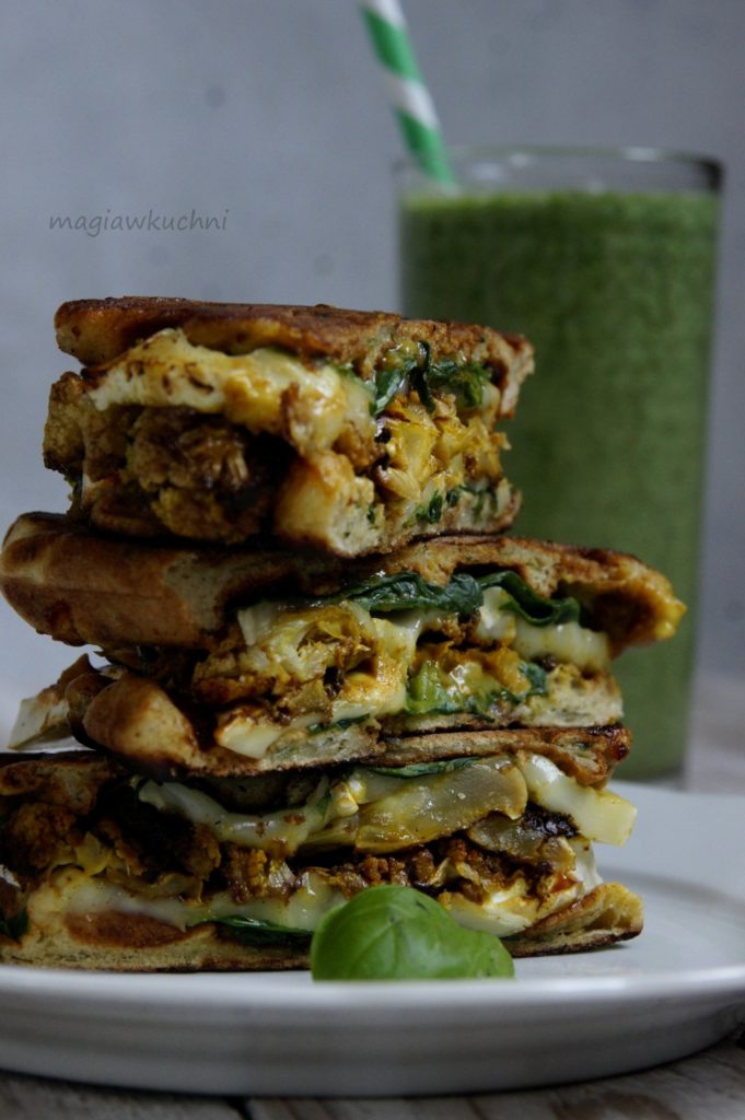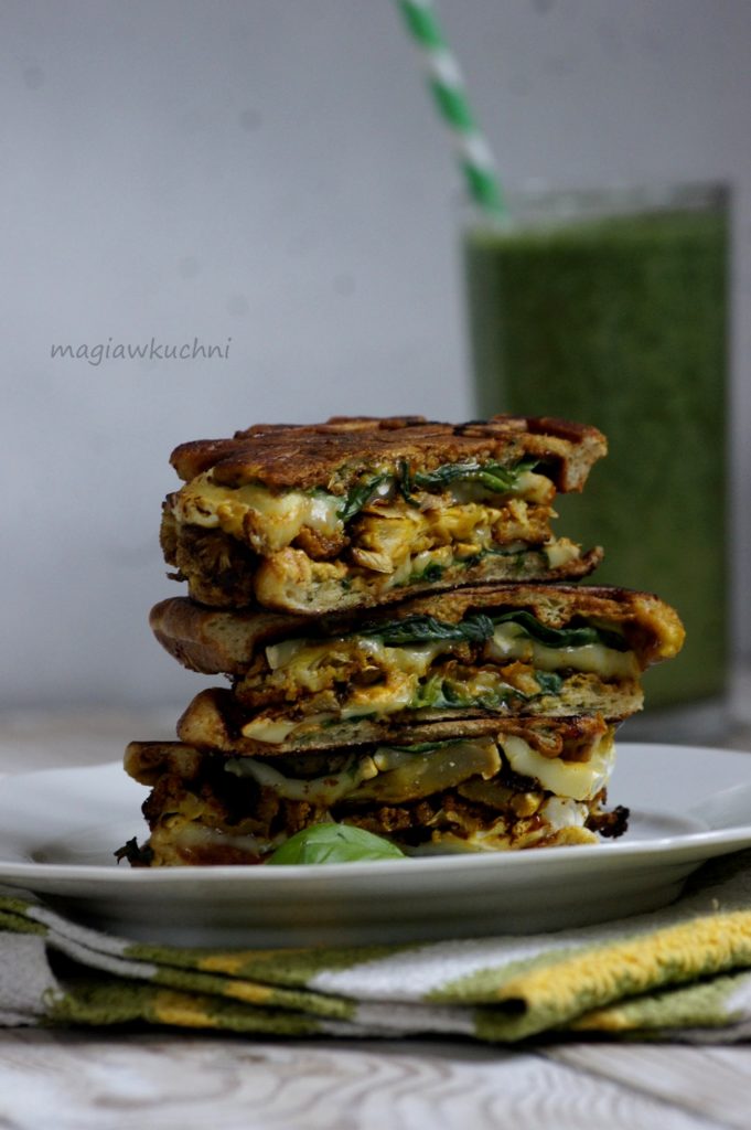 Grilowane kanapki z rana , oj bardzo je lubię z różnymi dodatkami w zależności co akurat jest w domu – można komponować z różnymi smakami. Z dużą ilością sera pleśniowego to jeden z moich ulubionych zestawów do tego pieczony kalafior w przyprawach i dodatek mojego ulubionego sosu BBQ. polecam.