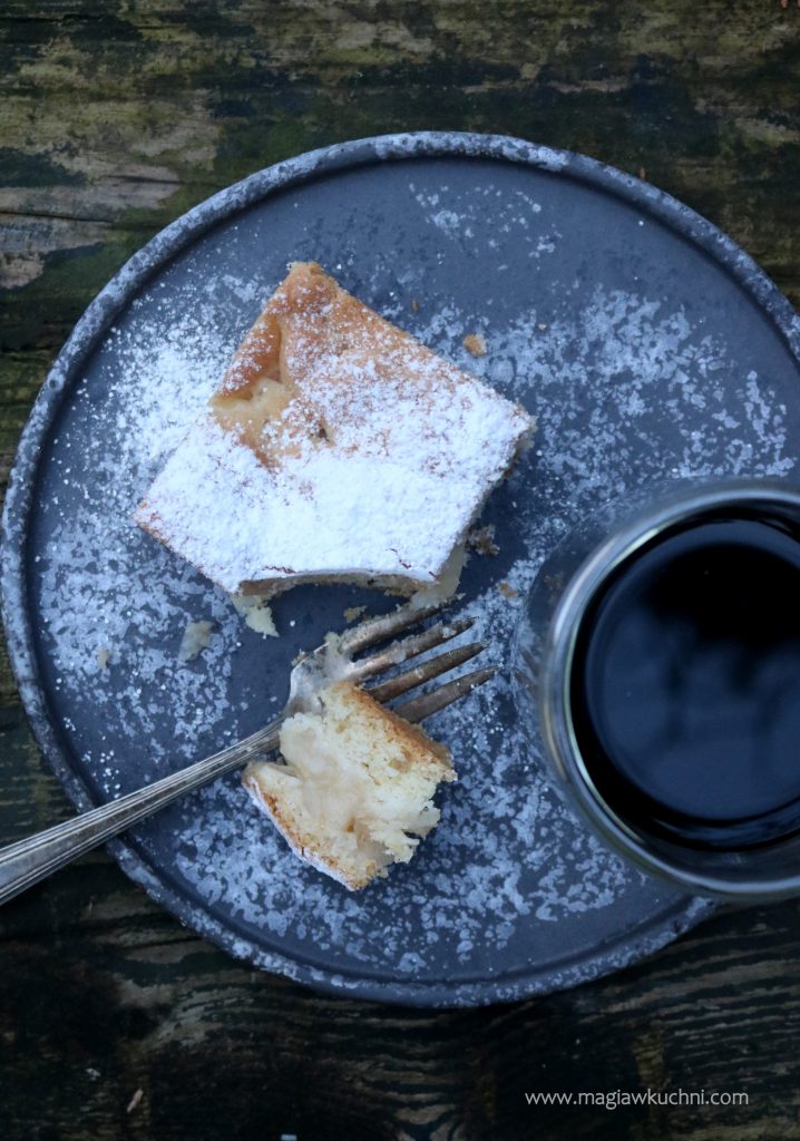 Jabłka umyć i obrać , pokroić w plasterki o grubości 3-4 mm następnie wrzucić do garnka z odrobina wody i prażyć aby lekko zmiękły. W drugim garnuszku rozpuścić masło z cukrem – wystudzić. Mąkę wymieszać z proszkiem do pieczenia, formę wyłożyć papierem do pieczenia. Do przestudzonego masła z cukrem wbić jajka i połączyć , następnie wsypać powoli mąkę wymieszaną z proszkiem . Połowę ciasta wyłożyć do blaszki i rozłożyć tak aby pokryła całe dno, ręce maczać w dodatkowej mące wtedy lepiej będzie rozprowadzić. Wyłożyć jabłka na to wykładamy resztę ciasta ( najlepiej brać po łyżce w dłonie obsypane mąką i układać po kawałku na jabłkach) Wstawić ciasto do nagrzanego piekarnika 180 C i piec ok 50 minut do tzw. suchego patyczka. Wystudzone ciasto można posypać cukrem pudrem .