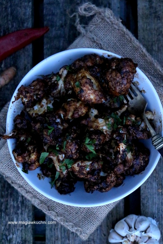 Kalafior oczyścić i podzielić na mniejsze różyczki , w misce wymieszać mleko z wodą i mąkami oraz solą. Ciasto powinno mieć konsystencję gęstej śmietany, tak aby oblepiło kalafior ale nie było zbyt gęste. Kalafior wymieszać w cieście żeby pokryło wszystkie różyczki – położyć na karakę aby ociekło z nadmiaru ciasta. Formę z piekarnika wyłożyć papierem do pieczenia i ułożyć kawałki kalafiora , wstawić do nagrzanego piekarnika i piec ok 20 minut w 200 C w połowie czasu obrócić warzywa. Teraz przygotować sos. Czosnek pokroić w drobniutką kostkę i przesmażyć krótko na tłuszczu – uważać aby się nie spalił . Dodać sos sojowy, mus daktylowy, chili oraz tarty imbir i kurkumę całość gotować na małym ogniu aż sos zgęstnieje .