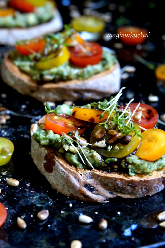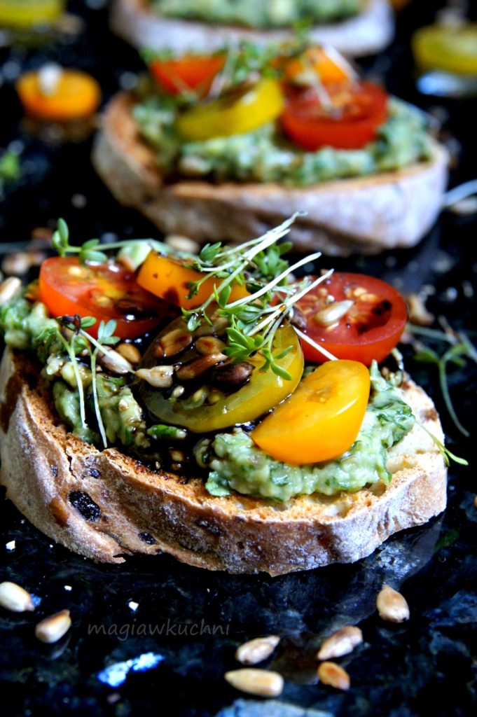 Z pastą przygotowaną z avokado , delikatna i chrupiąca dzięki dodatkowi prażonego słonecznika. Do tego kilka kolorowych pomidorków oraz całość polana odrobiną octu balsamicznego. Na koniec posypać świeżą rzeżuchą .