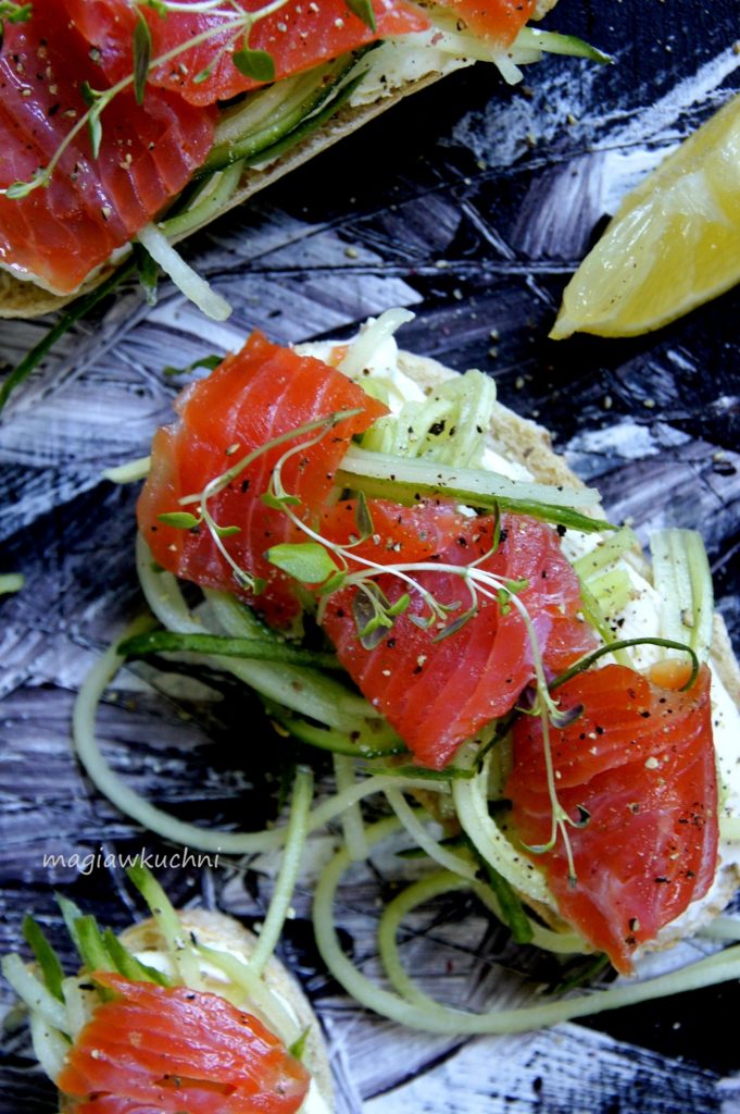 Dziś kanapki na śniadanko, ale można je zrobić również w wersji mini np na imprezę karnawałową. Kanapeczki z kremowym mascarpone do tego paseczki chrupiącego ogóreczka i pyszny kremowy wędzony łosoś skropiony sokiem z cytryny i cóż nam więcej potrzeba…