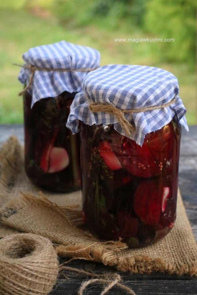 Przygotować słoiki litrowe wyparzyć i odstawić. Buraki wyszorować poodcinać końcówki z obu stron pokroić na mniejsze kawałki wrzucić do każdego słoika, teraz dodaję na każdy słoik po łyżeczce gorczycy, dwa liście wiśni, dwa liście winogron, dwa liście czarnej porzeczki,kawałek łodygi lubczyku, małą gałazkę kopru ,kawałek chrzanu oraz kawałek liścia aby przykryć całość. W chłodnej wodzie na jeden litr mieszam 3/4 łyżki soli można zwiększyć sól do 1 łyżki ale jak dla mnie wychodzą zbyt słone. Buraki zalewam wodą wymieszaną z solą ponad zawartość słoika tak aby wszystko było przykryte. Zakręcić słoik i odstawić w ciepłe miejsce gdy zobaczymy że zaczną nam buzować wynosimy do piwnicy. Tak przygotowane buraki można przechowywać nawet kilka lat.