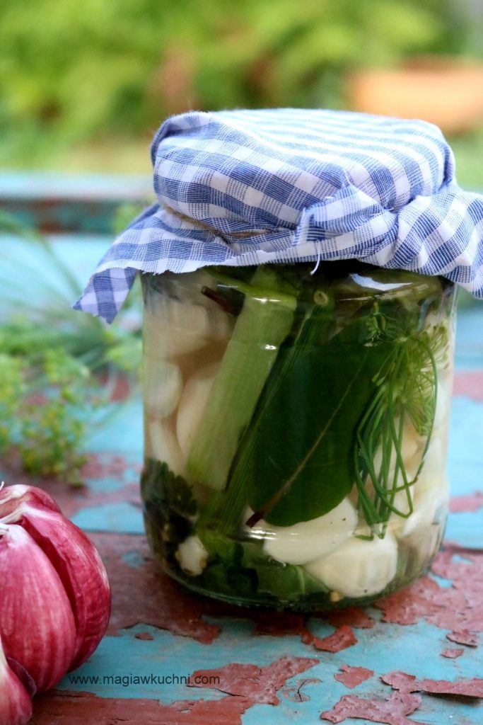 Słoiki i zakrętki wyparzyć , odstawić . W chłodniej wodzie wymieszać sól do rozpuszczenia. Czosnek podzielić na ząbki i obrać ze skórki , korzeń chrzanu obrać umyć i podzielić na małe kawałki, podzielić między słoiczki . Ząbki porozkładać w słoiczkach dodać po 1/5 łyżeczki gorczycy na słoiczek dodać kwiaty kopru łodygi chrzanu – całość przykryć liśćmi . Zalać letnią wodą z solą tak by liści były przykryte , zakręcić i odstawić w ciepłe miejsce gdy zaczną bąbelkować wynieść do chłodnej piwnicy.