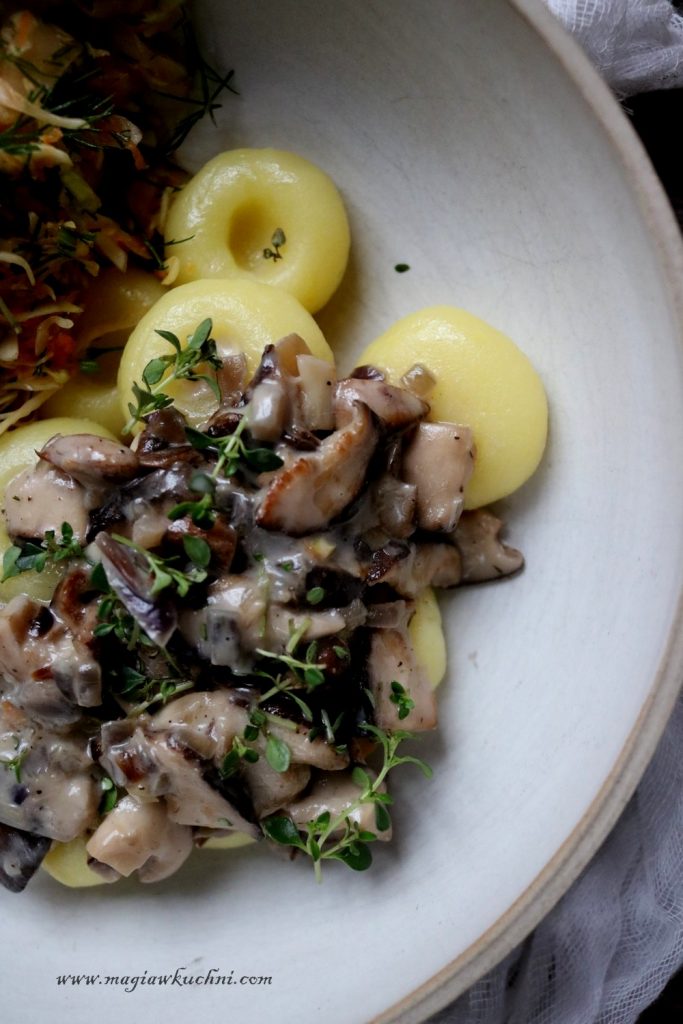 Kluski przełożyć na talerz i polać sosem grzybowym posypać dodatkowo świeżymi ziołami.