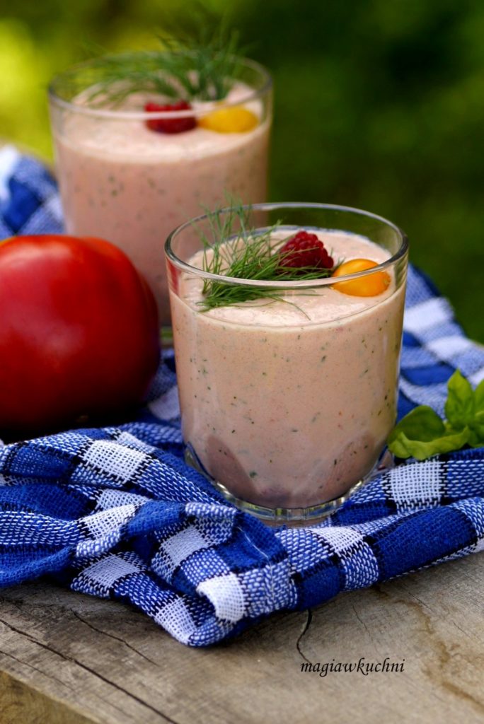 Odżywczy koktajl pomidorowy ze świeżymi ziołami oraz dodatkiem świeżych malin. Jest po prostu mega pyszny najlepiej smakuje latem. Bardzo często robię koktajle i sałatki choć nie zawsze uda się sfotografować przez zjedzeniem czy wypiciem … 🙂 polecam