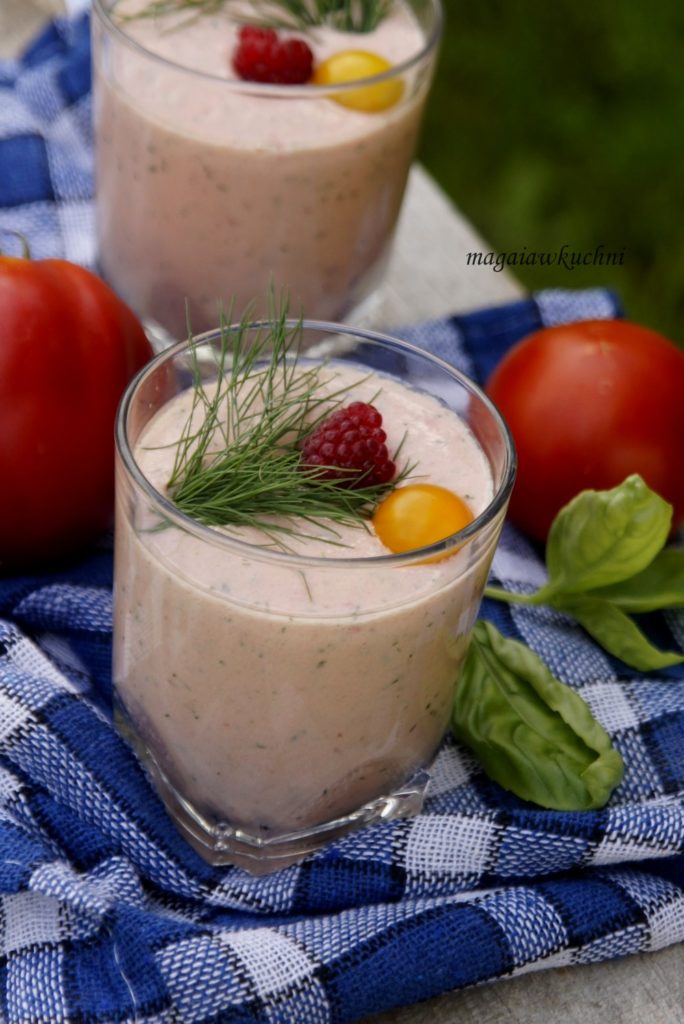Pomidory sparzyć i obrać ze skóry , wyciąć rdzeń i pokroić na mniejsze kawałki. Pokrojone pomidory przełożyć do miski dodać natkę pietruszki, listki bazylii, maliny oraz jogurt i przyprawy – zmiksować i ewentualnie doprawić do smaku.