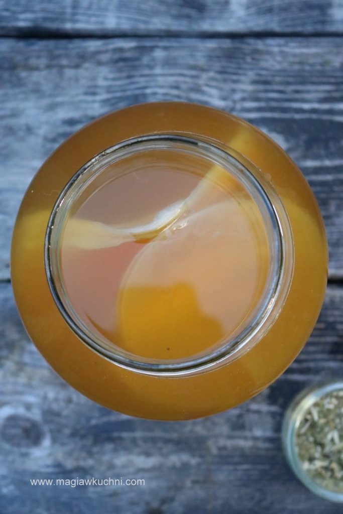 Do dużego wyparzonego słoika wsyp herbatę oraz cukier i zalej gorącą wodą ok 90 C zamieszaj drewnianą łyżką do rozpuszczenia cukru i ostudź dobrze.