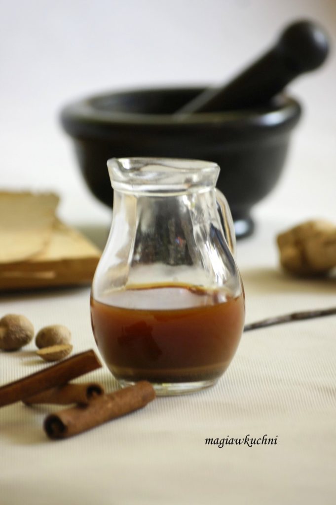 Nie użyłam zmielonych składników, starłam sama odrobinę laski cynamonu, gałki jedynie imbir był mielony, wydrążyłam nasionka z laski wanilii i dodałam goździki – wszystko utarłam jeszcze w moździerzu następnie zalałam spirytusem i przelałam do ciemnej butelki. Zaprawę tą odstawić na 14 dni w ciemne miejsce -wstrząsać co drugi dzień .