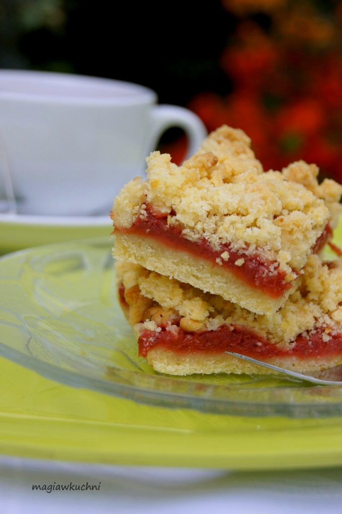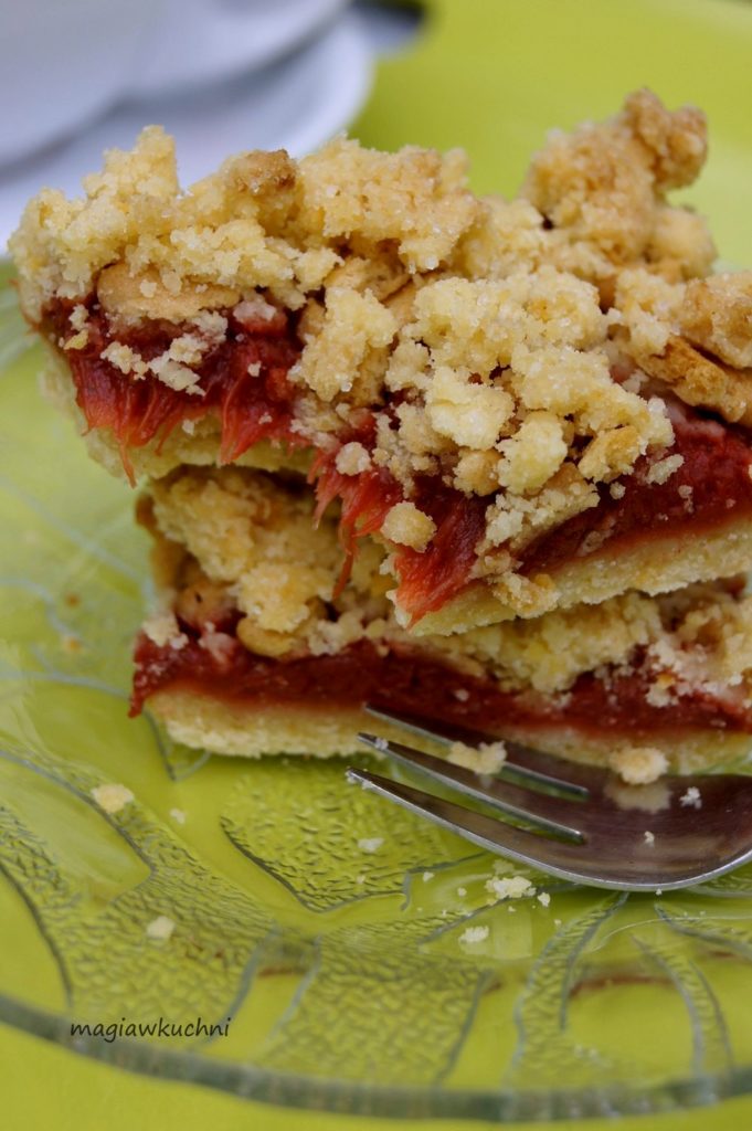 Dość kwaskowe ciasto rabarbarowe z truskawkami i herbatnikami bardzo smaczne 🙂 choć nie każdemu może przypaść do gustu. Osobiście uwielbiam chyba wszystko co kwaśne , ale jeżeli chcecie bardziej słodkie trzeba do nadzienia dodać więcej cukru. Polecam