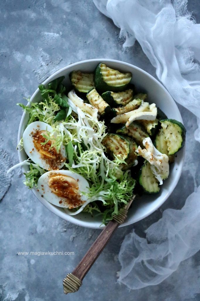 Przełożyć do miseczek dodać sałatę skropić ją oliwą na cukinię poukładać po kilka plastrów sera pod wpływem ciepła roztopi się a cukinia nabierze ciekawego smaku . Podawać z jajkami ugotowanym na półtwardo posypane posypką dukkah.