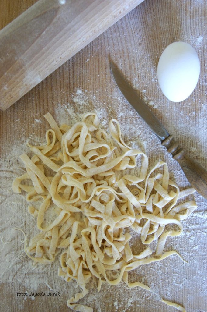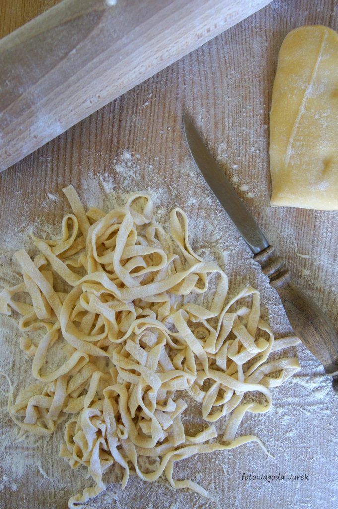 Po tym czasie rozwałkowywać na cienkie placki i ciąć makaron.Ręcznie lub przez maszynkę.