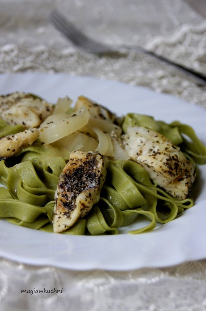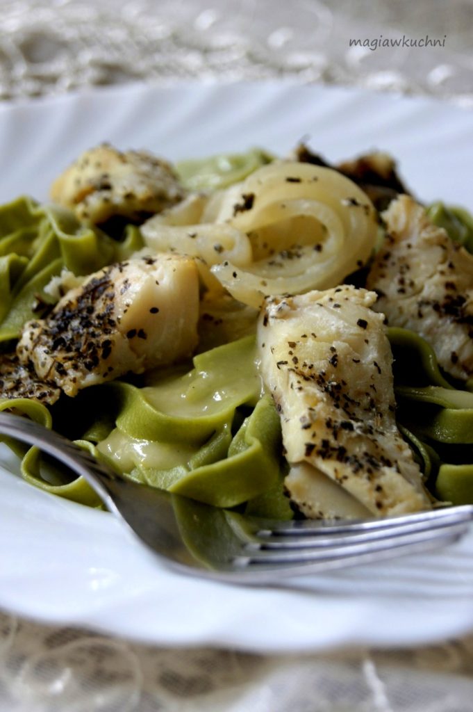 Makaron szpinakowy z rybą