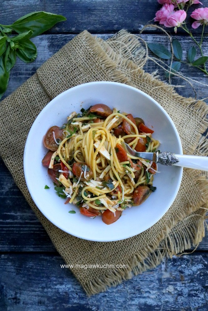 Ostatnie dni ciepła wykorzystujemy na prace w ogrodzie i przygotowujemy się do zbliżającej się jesieni. Robimy porządki i zrywamy ostatnie pomidory, a kiedy brak czasu na gotowanie taki makaron robi się praktycznie sam w15 minut i obiad na stole pyszny, aromatyczny z pomidorkami z ogrodu 😉 Polecam