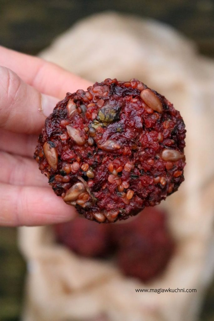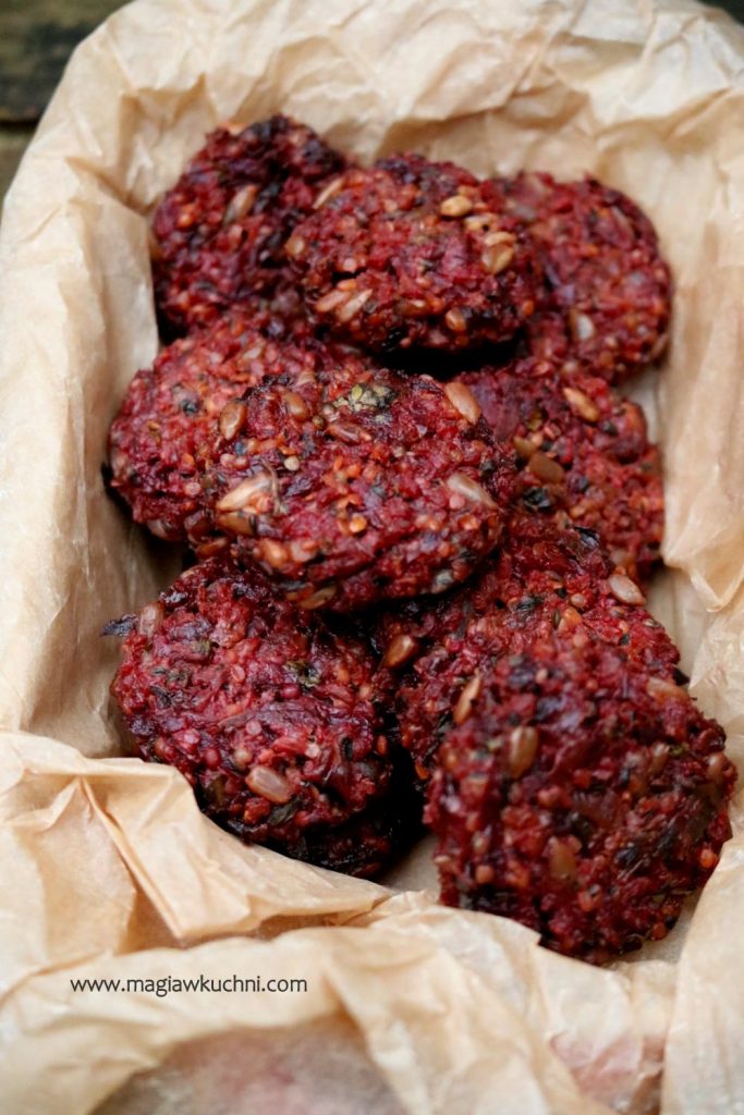 Buraki umyć i przełożyć do naczynia żaroodpornego , piec w piekarniku 200 C do miękkości ok godzinę. Cebulę usmażyć na niewielkiej ilości oliwy- przestudzić i dodać do buraków. Upieczone buraki zetrzeć na tarce o średnich oczkach. Ugotować kaszę według przepisu na opakowaniu , przestudzić i dodać do buraków wraz z przyprawami – wyrobić masę rękoma – na tym etapie można spróbować czy wystarczy dla nas przypraw. Teraz dodajemy jajko i płatki drożdżowe ponownie wyrobić. Blachę od piekarnika wyłożyć papierem do pieczenia formować małe kotleciki , ręce moczyć w wodzie i brać po łyżce masy wielkości orzecha włoskiego i formować kotleciki – układać na blaszce . Wstawić do nagrzanego piekarnika 170 C i piec ok 20-30 minut do zrumienienia się , następnie odwrócić i dopiekać jeszcze z 10 minut . Kotleciki można mrozić lub przechowywać w lodówce do trzech dni.