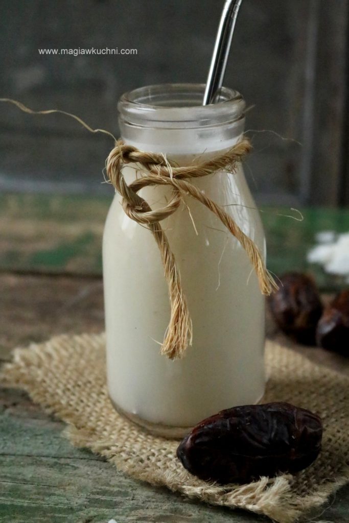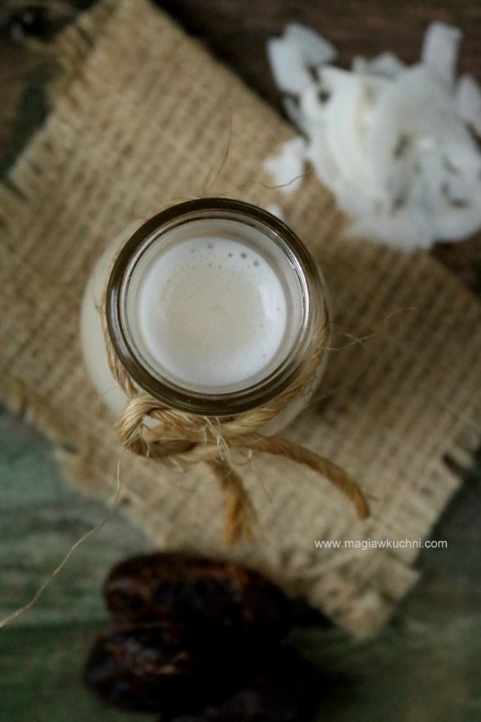 Do blendera wsypać wiórki z kokosa można użyć suszonych lub świeżych dodać gorącej wody oraz daktyla lub niesiarkowe morele i zmiksować przez 2 minutki . Odstawić na 15 minut po czym przecedzić przez gazę , przestudzić i przechowywać w lodówce . Przed użyciem wstrząsnąć , mleko może się rozwarstwiać na górze będzie się pojawiał tłuszcz kokosowy.