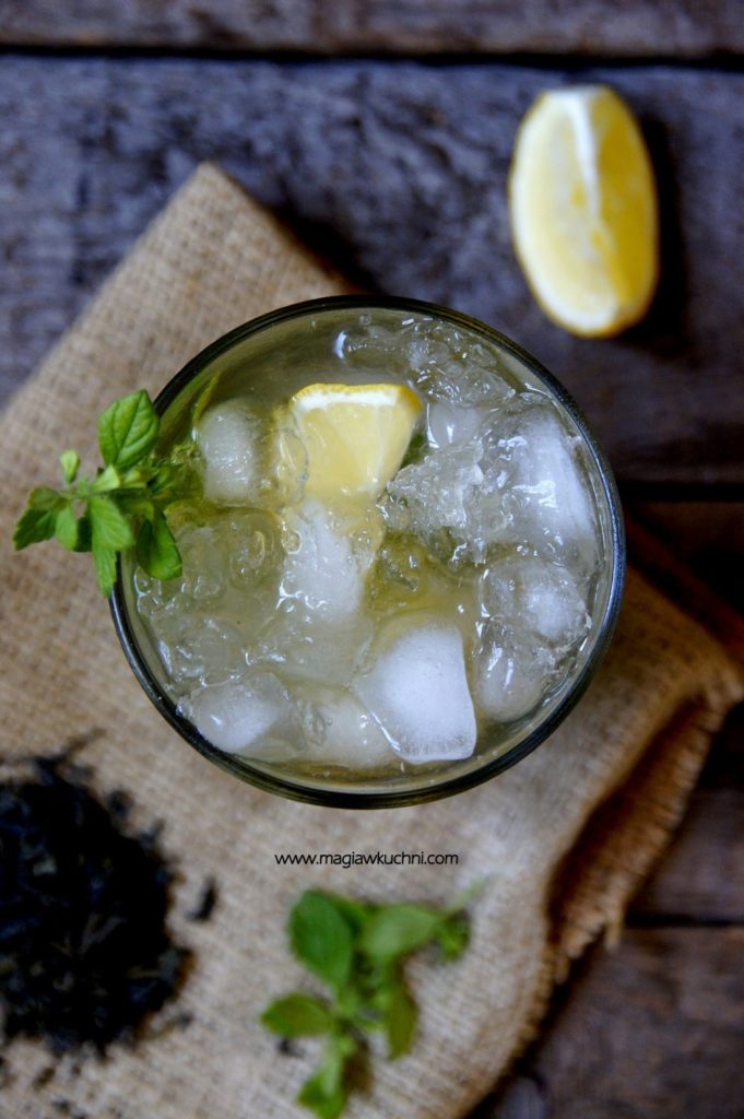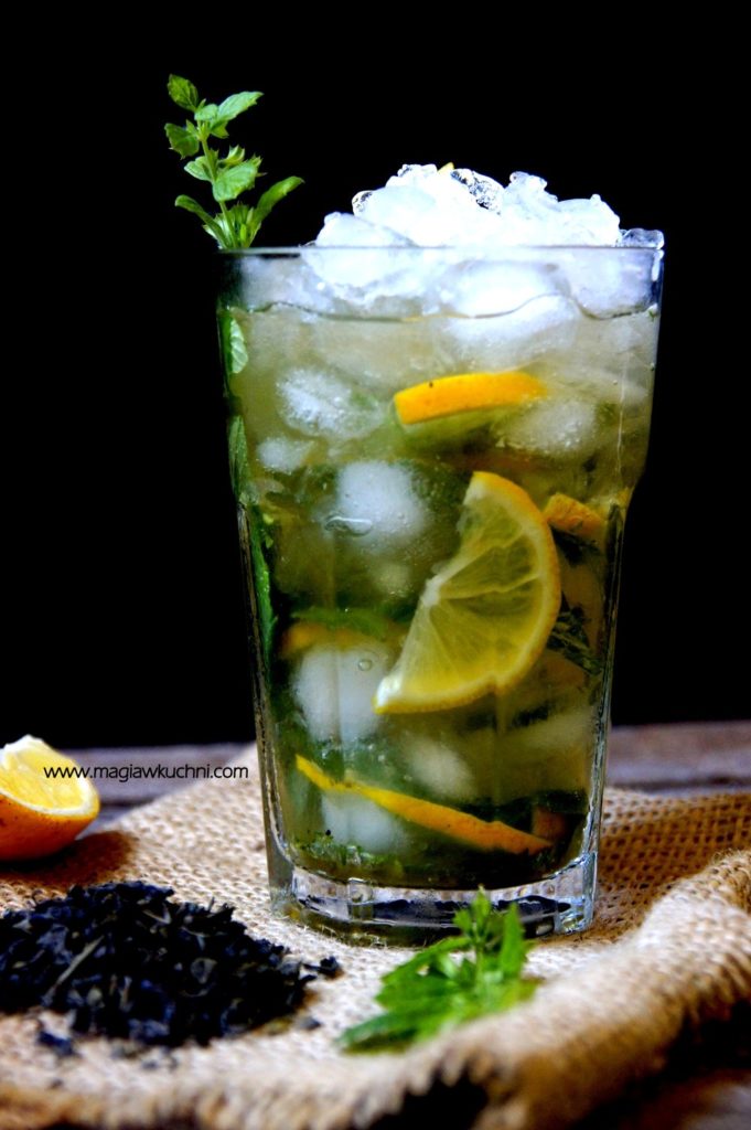 Połówkę cytryny pokroić w plastry i zamrozić , herbatę zaparzyć ewentualnie posłodzić i odstawić do przestudzenia .Druga połówkę cytryny kroimy na ćwiarteczki i przekładamy do naczynia wraz z listkami mięty – zalewamy syropem cukrowym i ugniatamy aż puści sok w tym momencie należy wymieszać z alkoholem . Teraz wrzucamy do szklanki lód, zmrożone plasterki cytryn ,świeże listki mięty oraz przecedzamy wcześniej przygotowany napój alkoholowy wlewamy do szklanki – dopełniamy zielona herbatą.