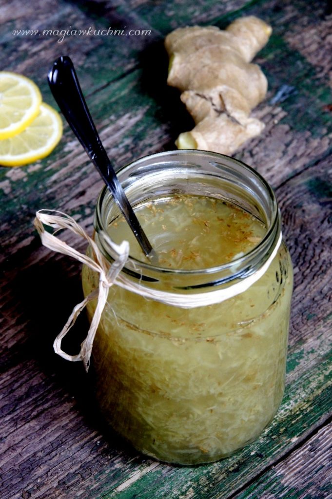Imbir umyć i zeskrobać skórkę (niekoniecznie) następnie zetrzeć na tarce na średnich oczkach przełożyć cały miąższ do słoika trochę powyciskać rękoma aby puścił więcej soku. Następnie zagotować wodę i zalać całą zawartość zakręcić słoik i odstawić na minimum cztery godziny lub na całą noc – odcedzić i tak przygotowany napar trzymać w chłodnym miejscu np w lodówce.