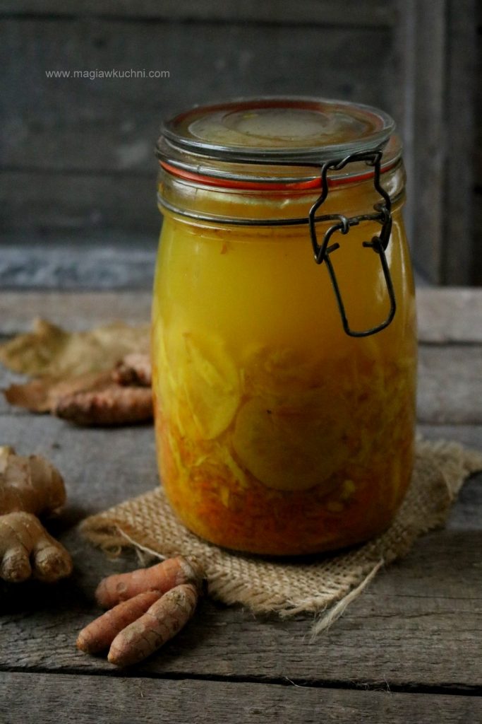 Korzenie umyć porządnie a następnie imbir i kurkumę umyć i zetrzeć na tarce jarzynowej , kurkumę ścieram na drobniejszych oczkach ( można zeskrobać skórkę za pomocą łyżeczki, ale nie jest to konieczne) . Zagotować litr wody , starte korzenie imbiru i kurkumy przekładamy do słoika , dokładamy plasterki cytryny oraz szczyptę ostrej papryki w proszku lub kilka plasterków świeżej.