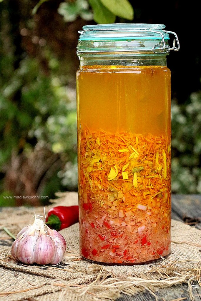 Wszystkie składniki umyć ,oczyścić i pokroić drobno lub zetrzeć – przełożyć do słoika i zalać octem . Miksturę odstawić na 2 tygodnie i wstrząsać codziennie, następnie po tym czasie odcedzić płyn i przelać do butelek z ciemnego szkła.