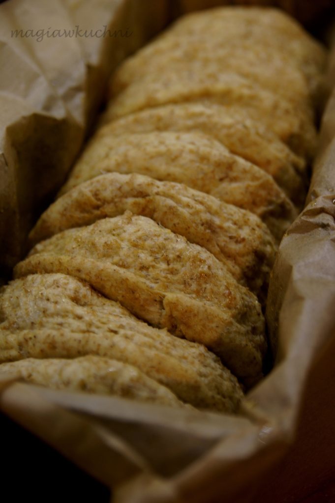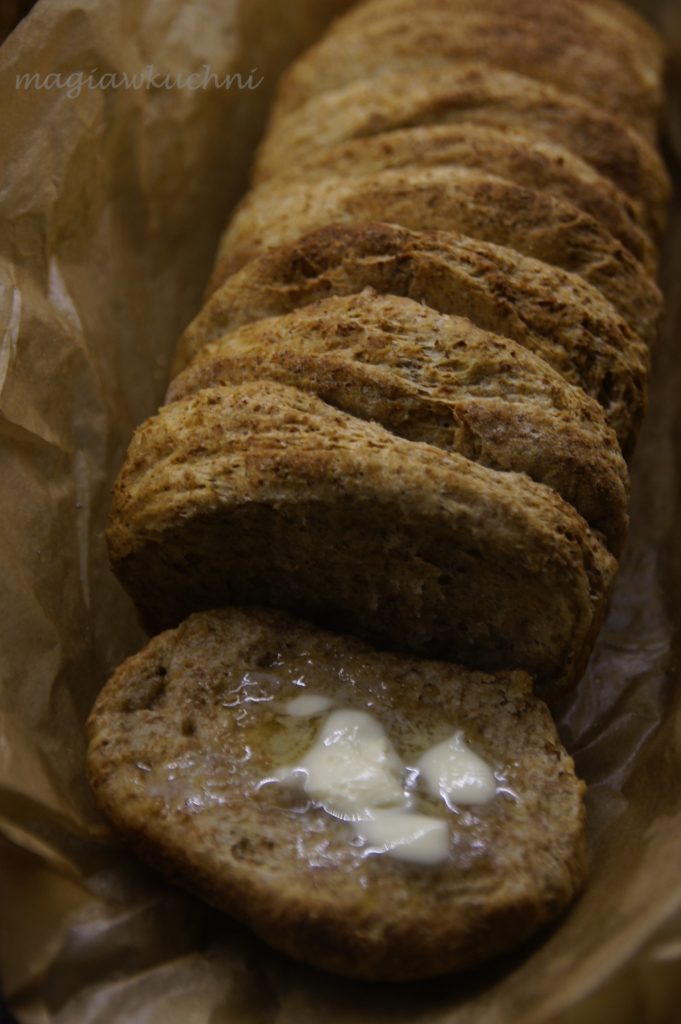 Ostatnio dużo piekę pieczywa różnego rodzaju, bardzo lubię te chleby, chlebki i bułeczki… uwielbiam zapach świeżego pachnącego pieczywa i jeszcze takie cieplutkie z topiącym masełkiem. Tym razem padło na dyniowe pure i to był świetny wybór bo dzięki niemu pieczywo jest chrupkie z wierzchu i mięciutkie w środku. Z pewnością zachowa długo swoją świeżość polecam…