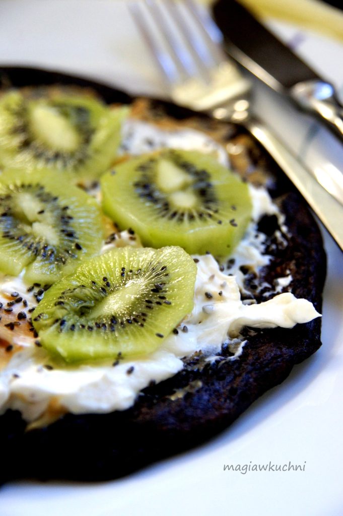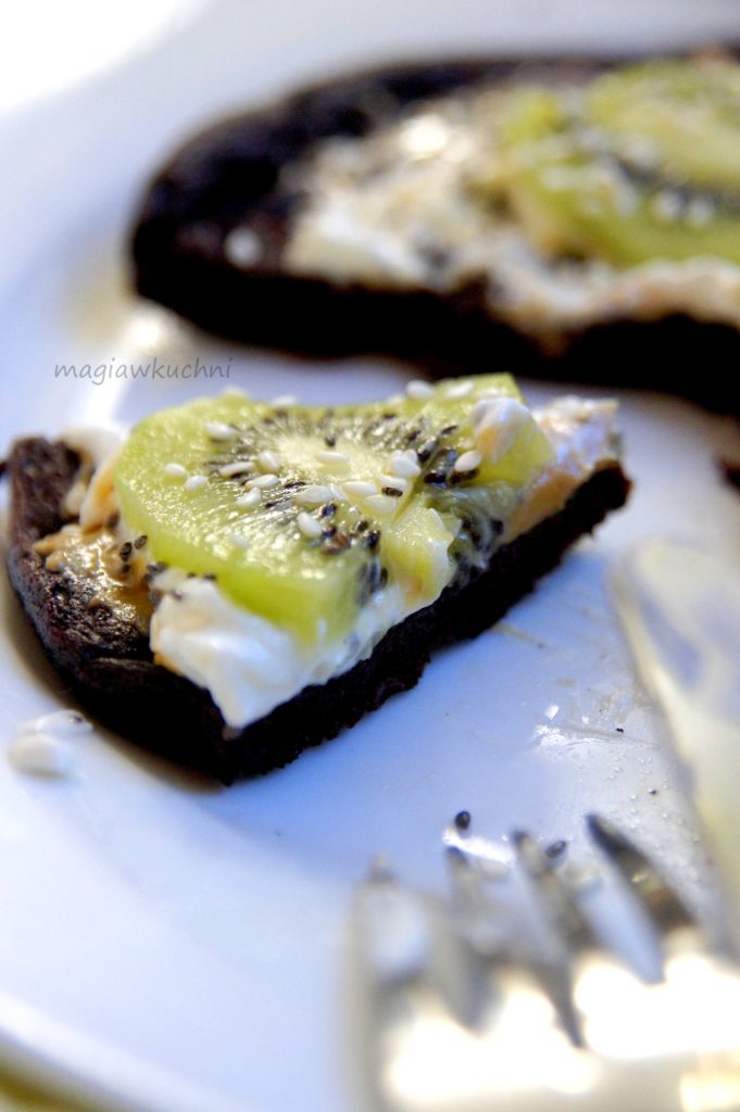 Białka ubić na sztywno ze szczyptą soli, następnie dodać miód, żółtka i kakao w proszku – delikatnie wymieszać. Na rozgrzaną patelnie z odrobiną tłuszczu wylać ciasto i smażyć na średnim ogniu, aż się zetnie i zrumieni,odwrócić na drugą stronę (przy pomocy łopatki) – smażyć na rumiano. Pod koniec smażenia położyć talerz na patelni dosłownie na minutkę aby lekko się ogrzał,(talerzem przykrywamy patelnię) zdjąć uważając przy tym aby się nie oparzyć. Przełożyć omlet na ogrzany talerz posmarować masłem orzechowym , twarogiem – ułożyć plasterki kiwi, posypać prażonym sezamem i ziarnami chia.