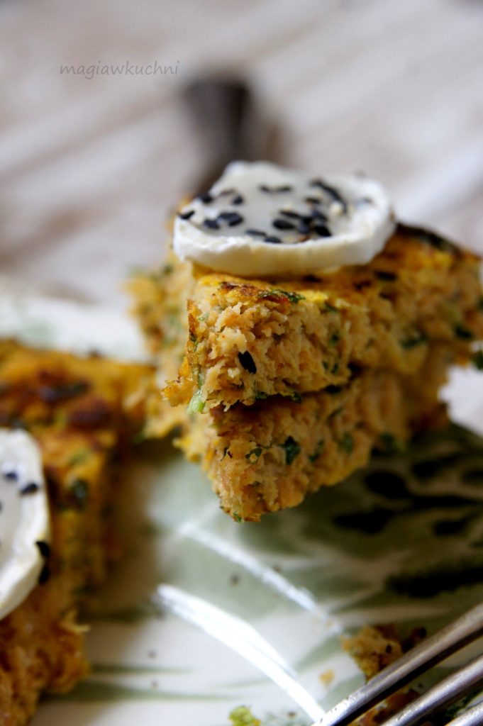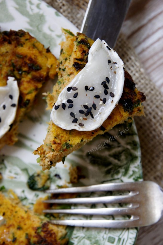 Żółtka oddzielić od białek białka ubić ze szczyptą soli na sztywno , w międzyczasie wycisnąć sok z marchewki ( marchewkę trzeba wcześniej obrać). Soczek przelać do szklaneczki jeżeli jest za słodki można rozcieńczyć trochę wodą . Miąższ po wyciśniętym soku (dwie łyżki) dodajemy do ubitego białka wraz z żółtkami oraz wsypujemy jeszcze zioła, czarny sezam i delikatnie mieszamy razem z mąką .