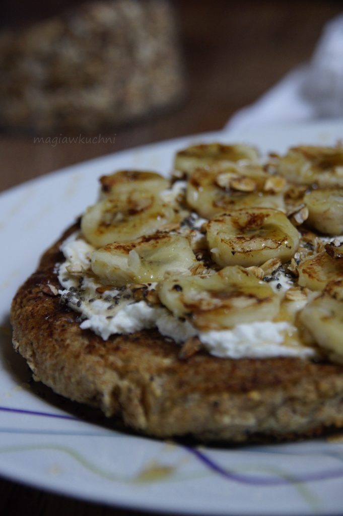 Białka ubić ze szczyptą soli dodać żółtka i zmielone płatki z orzechami – delikatnie wymieszać. Rozgrzać patelnie z odrobiną oliwy i wylać masę , smażyć na małym ogniu gdy się zrumieni i lekko zetnie przewrócić na drugą stronę . Gotowy omlet przełożyć na talerz posmarować twarogiem, posypać chia na to ułożyć banany posypać płatkami i polać płynnym miodem.