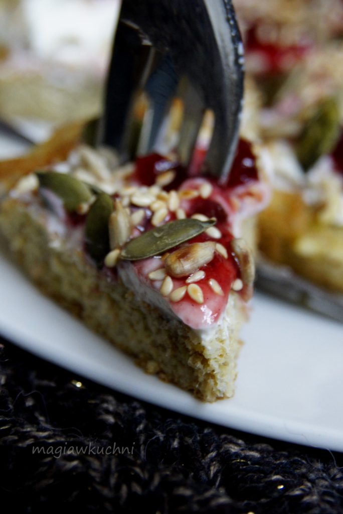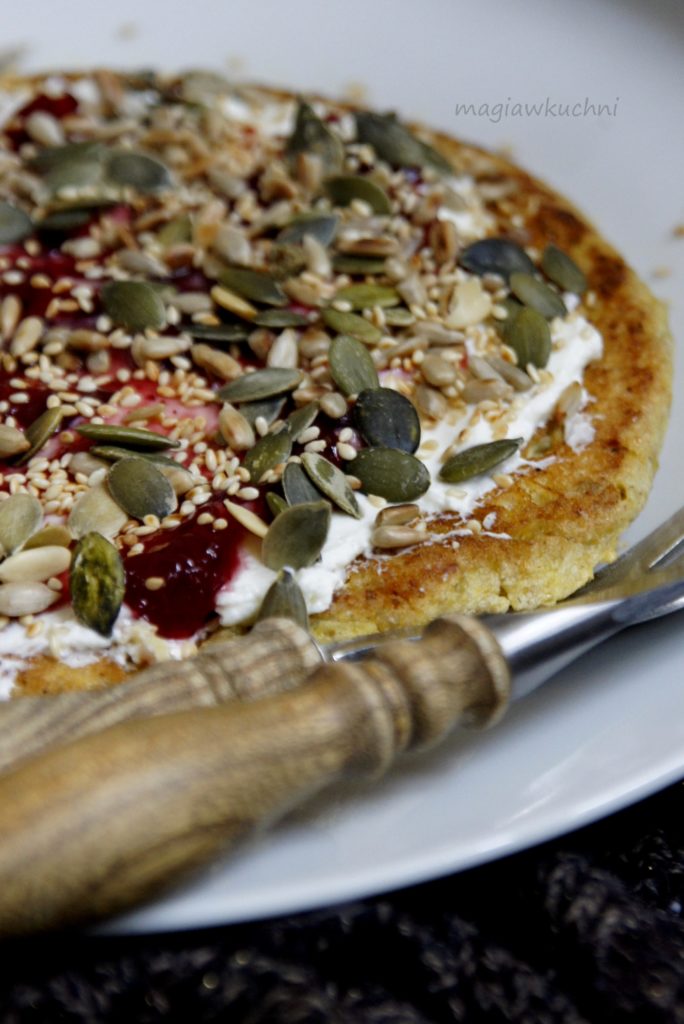 Omlet smaruję twarogiem oraz żurawiną i posypuję zrumienionymi ziarnami.