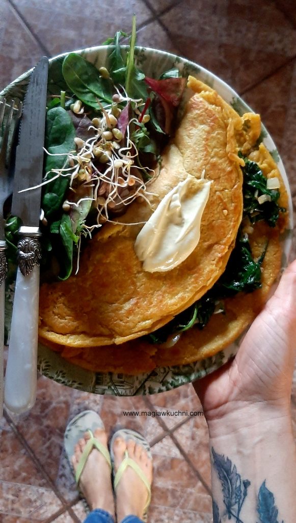 Wszyscy wiedzą że śniadanie to najważniejszy posiłek dnia, ale wiadomo nie każdy się do tego stosuje. Dziś mamy wolny dzień od pracy i tzw. leniwe i późne śniadanie . Czyli omlecik niedzielny który jest już u nas tradycją 😉 ,czasem nie tylko niedzielny …W zasadzie odkąd przeszłam na dietę wege wcale mi nie brakuje smaku jajek ,ale na pewno są takie osoby którym ich brak więc dziś wjechał oczywiście omlecik w wersji dla wegan . Omlet jest bogaty w białko dzięki mące z ciecierzycy, z wierzchu chrupiący a w środku wilgotny. Polecam