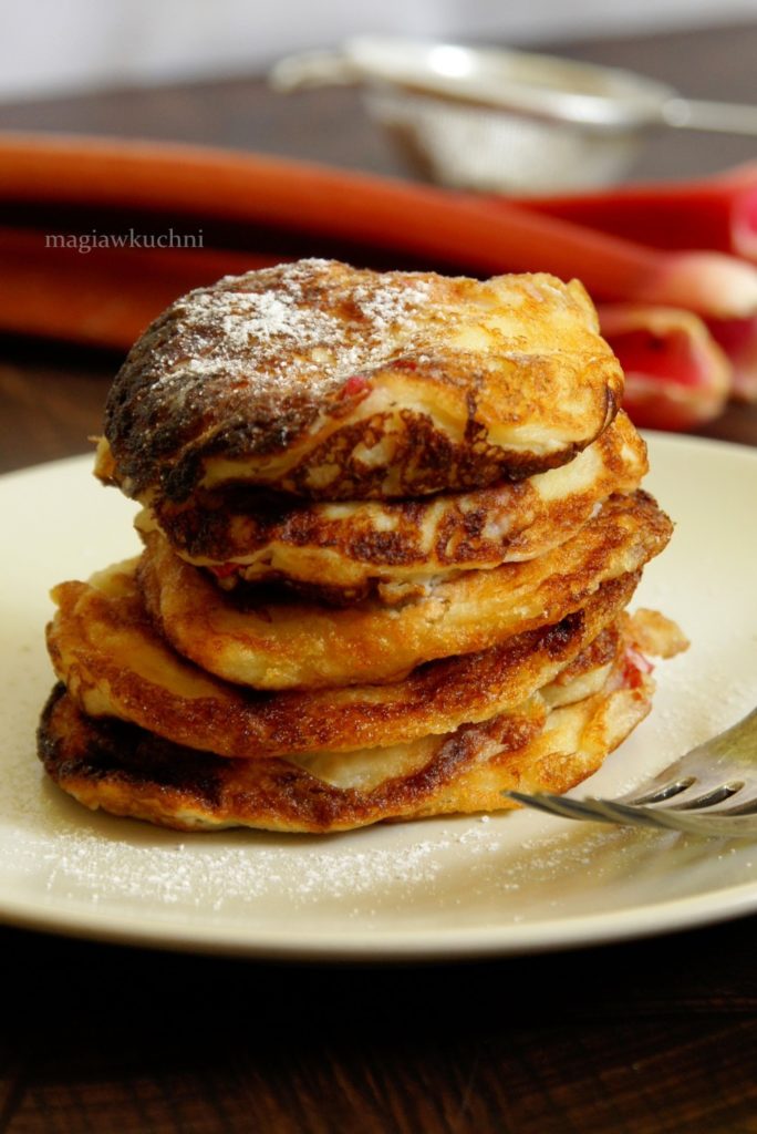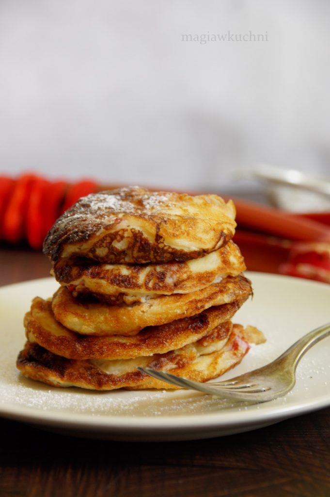 Bardzo delikatne puszyste pancakes z ricottą i rabarbarem – lekko kwaskowe. Jak dla mnie są super choć są osoby które nie lubią zbyt kwaskowych – więc można odrobinę zwiększyć ilość cukru ale nie za dużo żeby się nam nie paliły na patelni 🙂 Super smakują też z miodem lub syropem klonowym. Polecam
