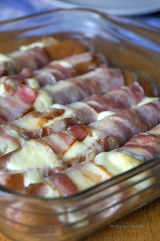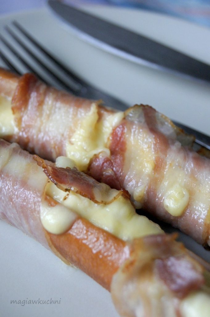 Z parówek zaciągamy folię następnie nacinamy przez środek tak by nie przeciąć z drugiej strony. I zostawić nienacięty koniec i początek. Następie ser przecinamy na dwa kawałki aby ułożyć je wzdłuż w parówce. Każdą kawałek obwijamy plastrem wędzonego boczku.