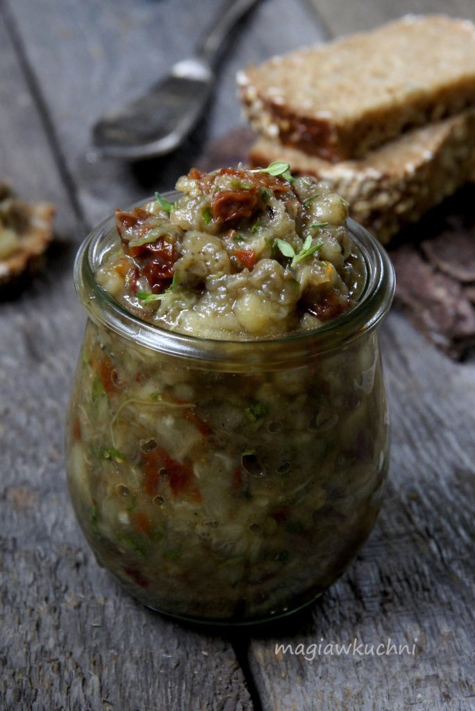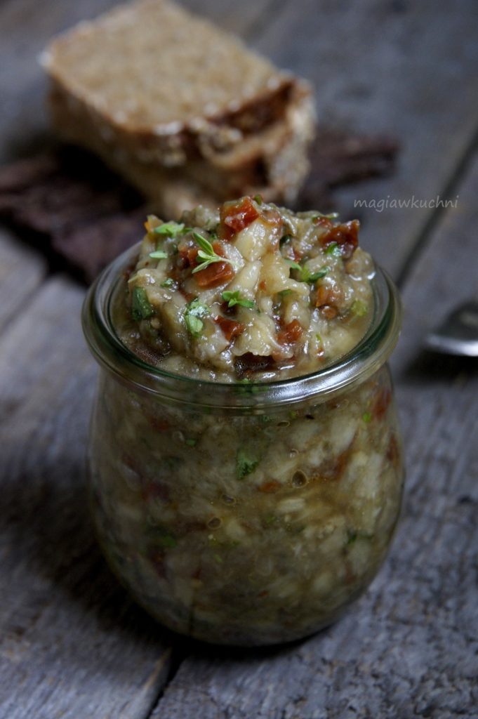 Bakłażany lekko przestudzić i obrać ze skóry – powinna sama odchodzić. Następnie pokroić wzdłuż w paski a potem kroić nożem wszerz w ten sposób wyjdzie nam kosteczka. Bakłażana przełożyć na sito i posolić dodać sok z cytryny i wymieszać – zostawić aby ociekł z nadmiaru soku. W międzyczasie pokroić w kostkę suszone pomidory i przełożyć do miseczki wraz z odsączonym bakłażanem. Obrać czosnek przecisnąć przez praskę wrzucić do miski dodać zioła i doprawić do smaku. Podawać z ulubionym chlebkiem, grzankami lub nawet wymieszane z makaronem z dodatkiem parmezanu lub dla wegan z płatkami drożdżowymi.